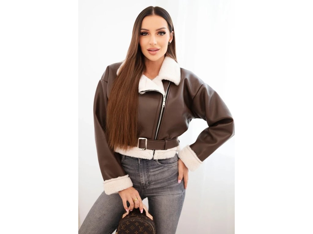Štýlová dámska kožená bunda Pilot je dokonalým spojením elegancie, moderného dizajnu a praktickosti. Tento model v krátkom strihu do pása je zateplený jemným bielym kožúškom pripomínajúcim ovčiu kožu, ktorý poskytuje hrejivosť a pohodlie počas chladných dní.Bunda má véčkový výstrih s klopom, dlhé rukávy a šikmé zapínanie na strieborný zips, ktoré jej dodáva originálny charakter. V páse je doplnená o opasok s prackou, ktorý pekne tvaruje postavu a dodáva modelu trendy vzhľad.