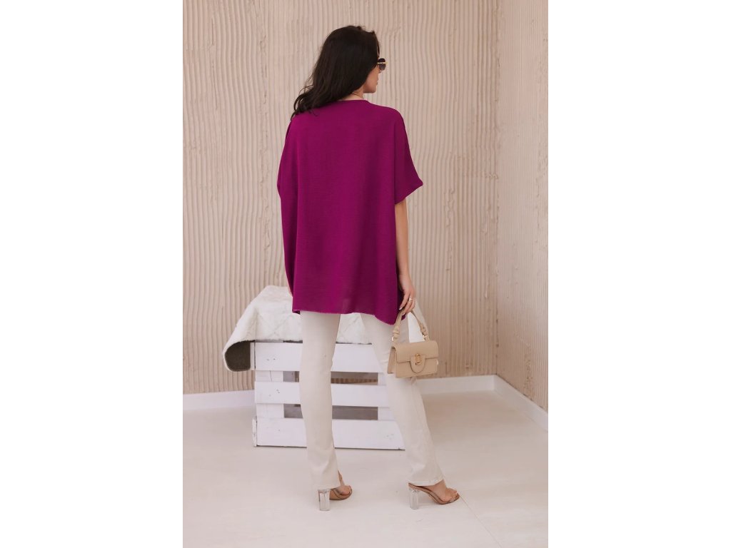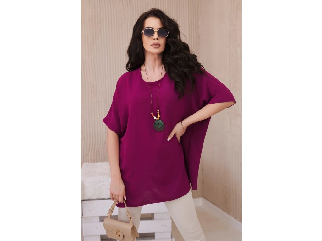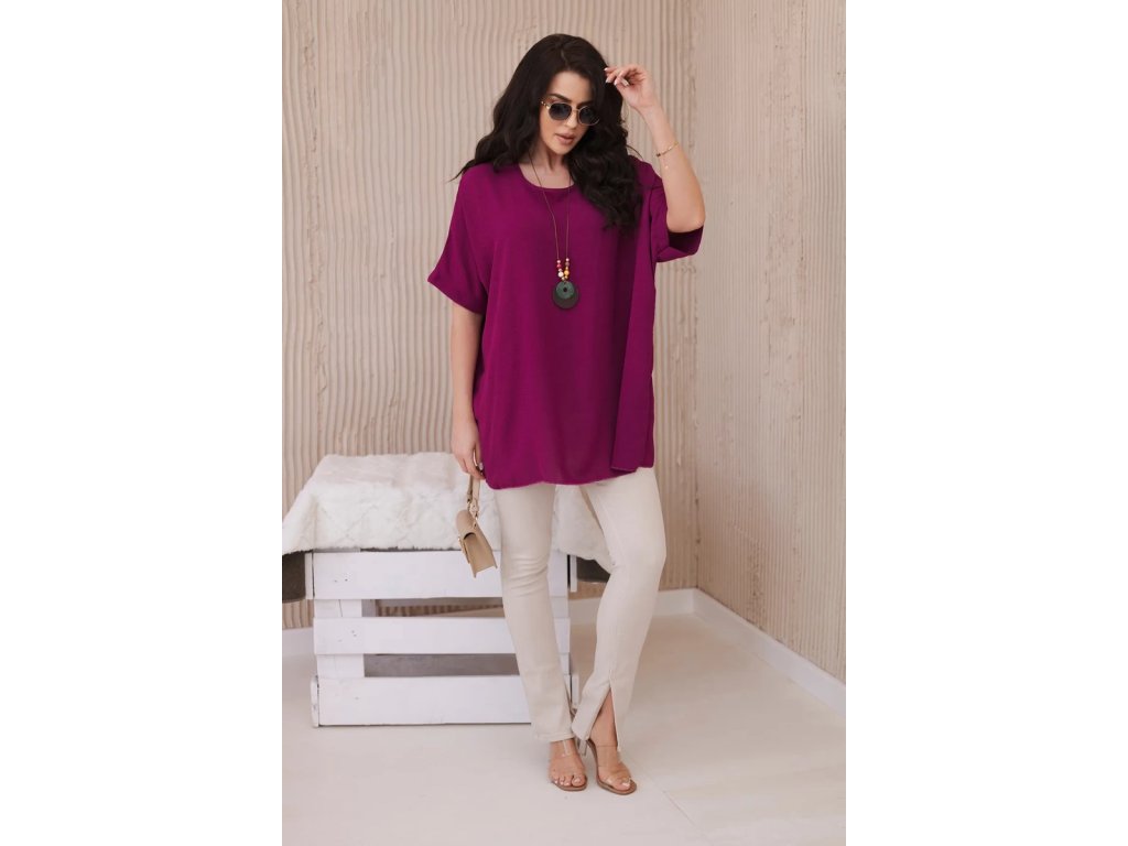 Blúzka má oversize strih s krátkymi rukávmi v prinechanom strihu. Celkový dizajn dopĺňa efektný dlhý prívesok, ktorý podčiarkuje celkový uvoľnený ráz tohto modelu. Použitý materiál s prímesou viskózy je ľahký, vzdušný, nekrčivý a dobre saje pot. Navyše je aj príjemne chladivý, čo v kombinácii s voľným strihom podčiarkuje vhodnosť tohto modelu do letných outfitov.Výhody dámskej blúzky Vera