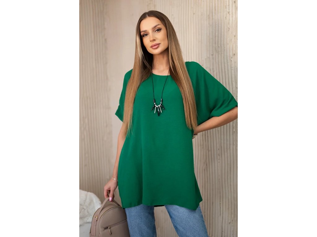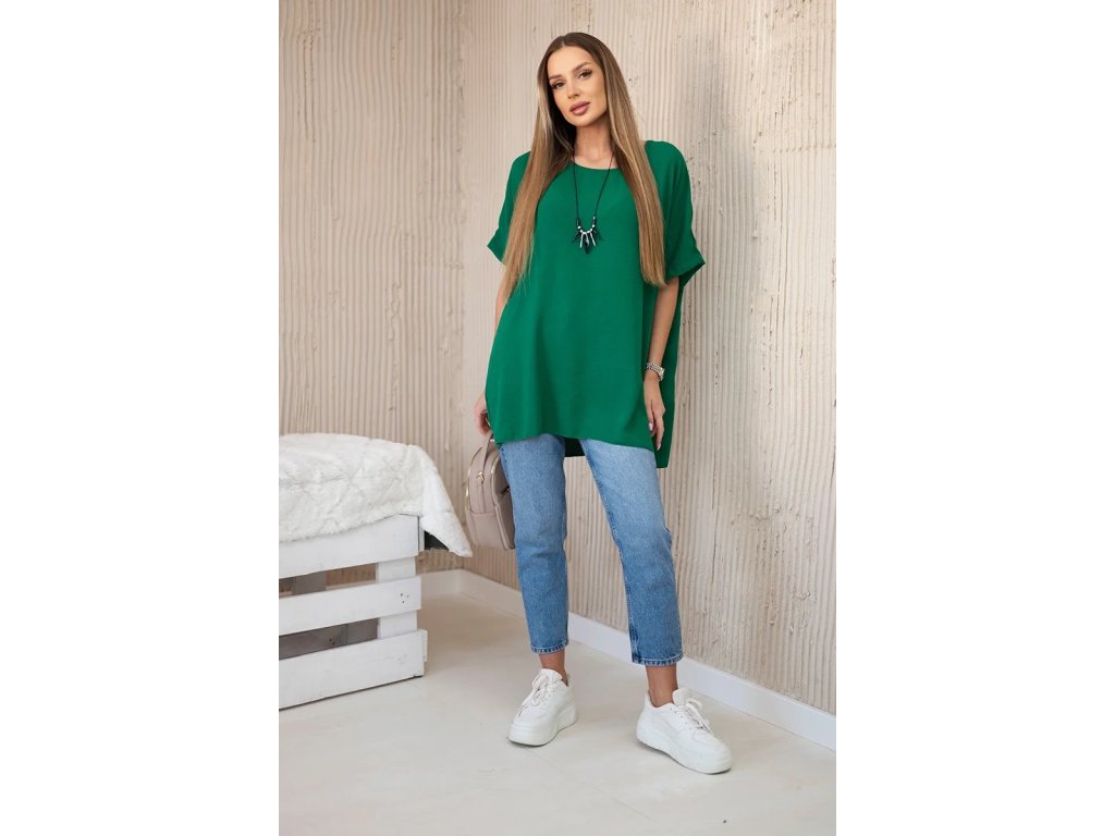 Blúzka má oversize strih s krátkymi rukávmi v prinechanom strihu. Celkový dizajn dopĺňa efektný dlhý prívesok, ktorý podčiarkuje celkový uvoľnený ráz tohto modelu. Použitý materiál s prímesou viskózy je ľahký, vzdušný, nekrčivý a dobre saje pot. Navyše je aj príjemne chladivý, čo v kombinácii s voľným strihom podčiarkuje vhodnosť tohto modelu do letných outfitov.Výhody dámskej blúzky Vera