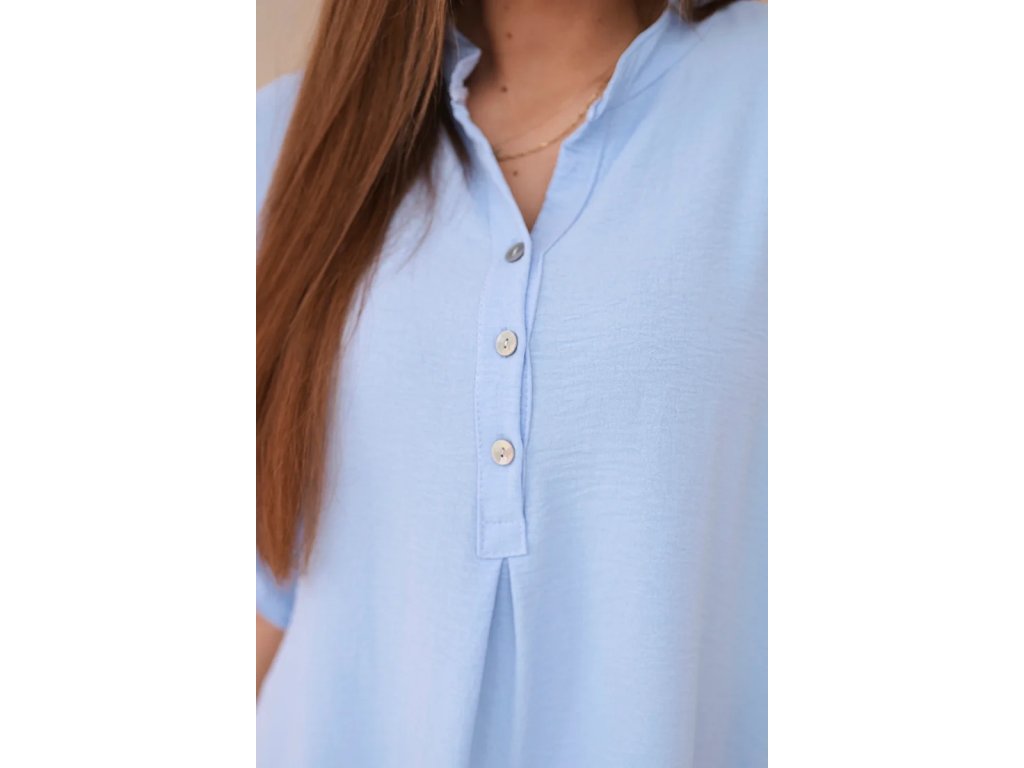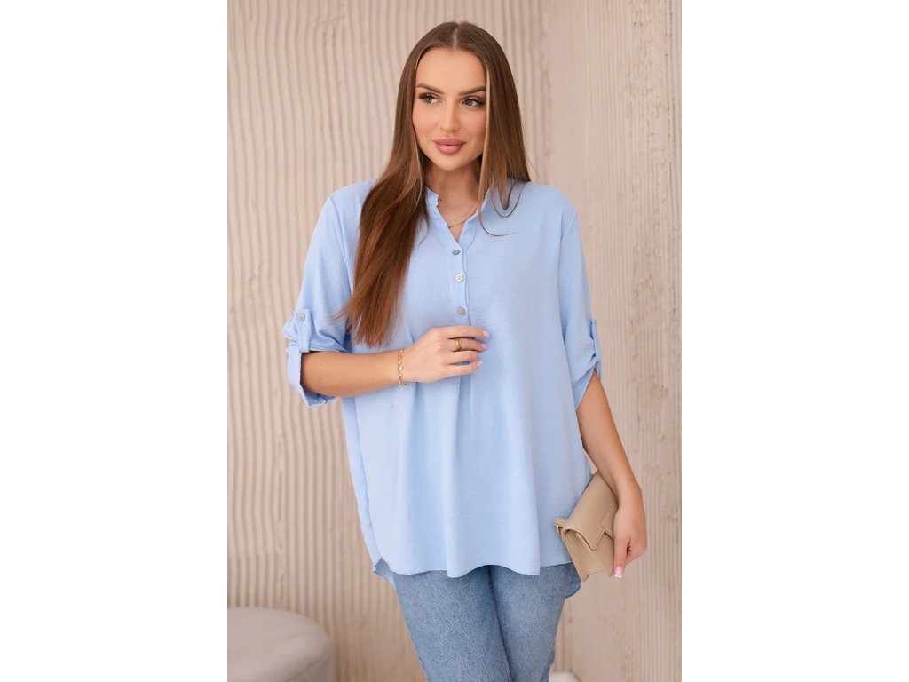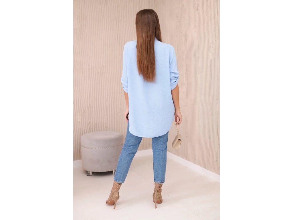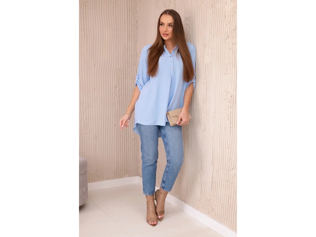 Táto blúzka nielenže vyzerá výnimočne štýlovo, ale poskytuje aj bezkonkurenčnú funkčnosť. Práve tú zabezpečuje voľný strih s predĺženou zadnou časťou, decentný véčkový výstrih s gombíkovou légou a vyhrnuté rukávy. Vďaka dlhšej zadnej časti vytvoríte jemné a módne nepravidelné proporcie a gombičkový výstrih vám umožní prispôsobiť si blúzku podľa vašich predstáv. Vyhrnuté rukávy dodávajú blúzke ľahkosť a ležérny charakter, vďaka čomu je ideálna na rôzne príležitosti. Celkovú styling podčiarkuje použitý materiál. Ten je ľahký, vzdušný a príjemný na nosenie.