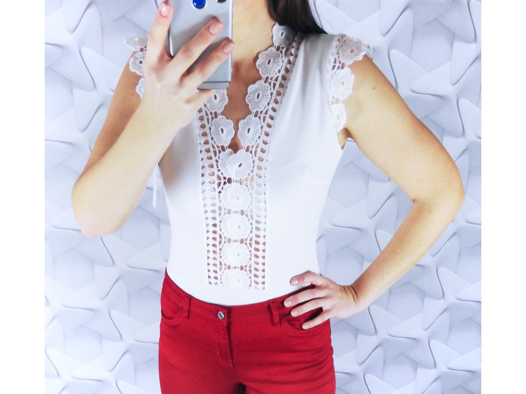 Elegantné dámske body bez rukávov s hlbokým véčkovým výstrihom ktorý je lemovaný efektnou čipkou ktorá upúta pohľady a zároveň dodáva celému modelu sexi vzhľad. Rovnakú čipku nájdete aj na lemovaní rukávov ako aj na chrbte. Body má rovnaké prevedenie z oboch strán. Body je šité z elastického nepriehladného úpletu, vďaka ktorému má priliehavý strih takže sa prispôsobí postave a zvýrazní ženské krivky.