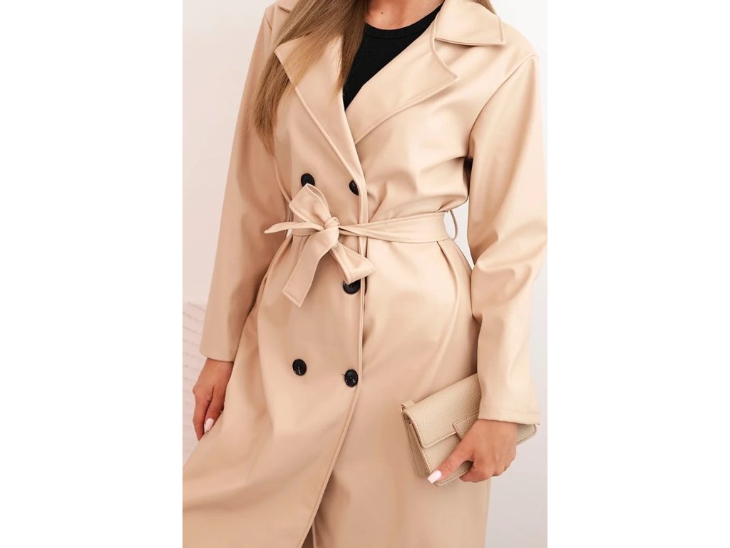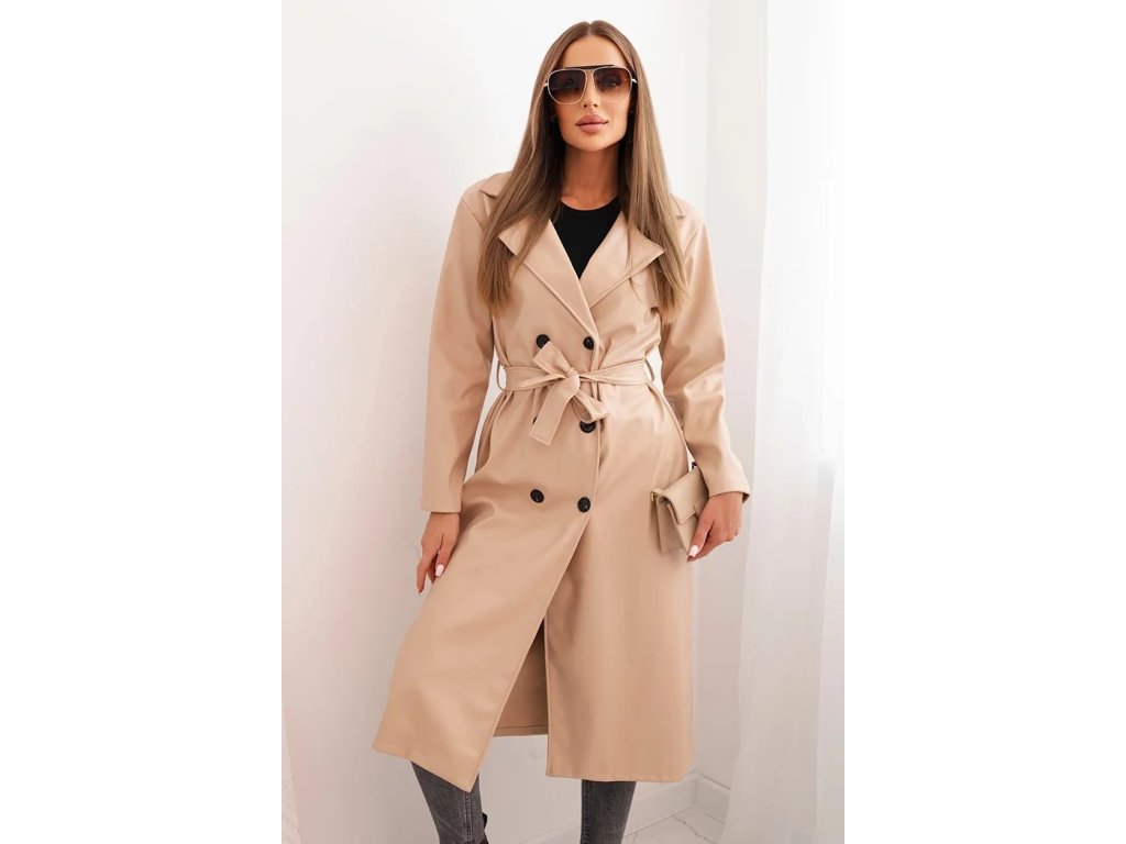 Kabát je vybavený dvojradovým zapínaním, véčkovým výstrihom s golierom a praktickým viazaním v páse, ktoré krásne zvýrazní ženskú siluetu. Dve bočné vrecká pridávajú funkčnosť a komfort, zatiaľ čo jemná eko koža s realistickým vzhľadom pripomína pravú kožu.