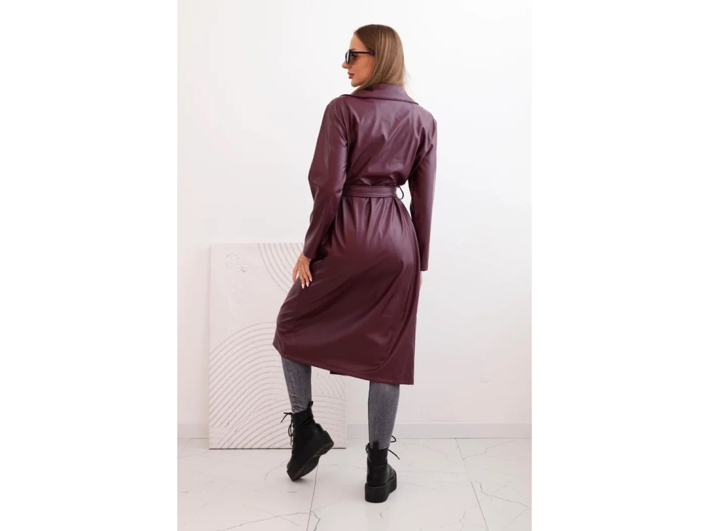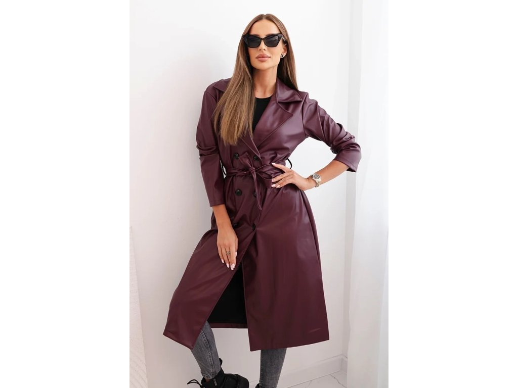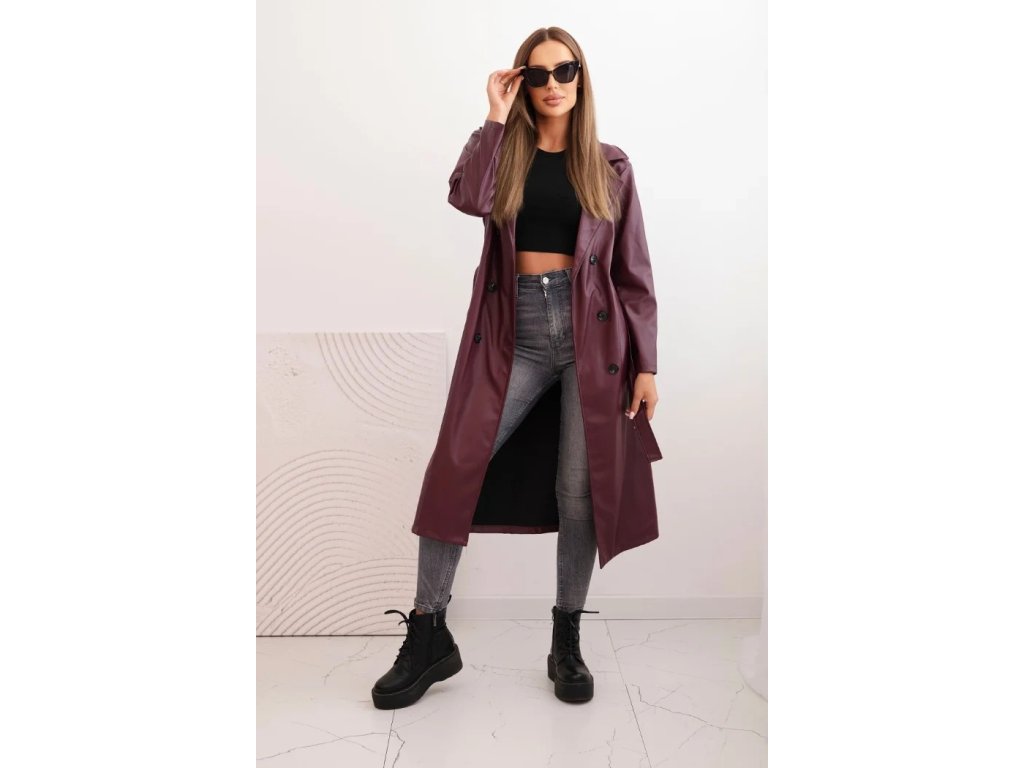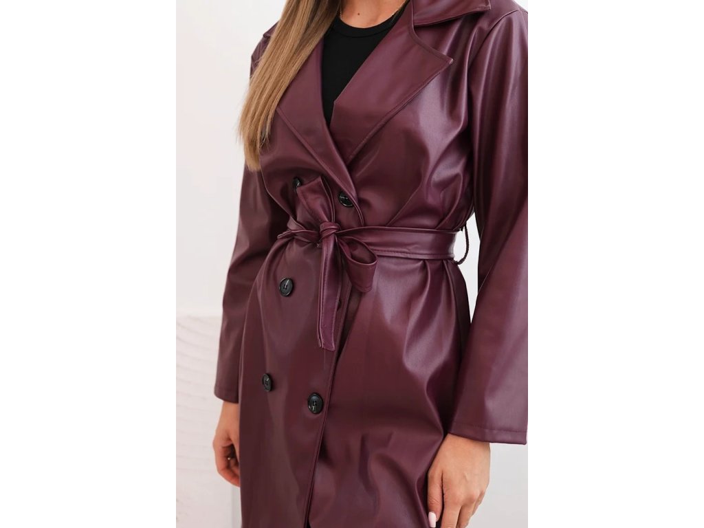 Kabát je vybavený dvojradovým zapínaním, véčkovým výstrihom s golierom a praktickým viazaním v páse, ktoré krásne zvýrazní ženskú siluetu. Dve bočné vrecká pridávajú funkčnosť a komfort, zatiaľ čo jemná eko koža s realistickým vzhľadom pripomína pravú kožu.
