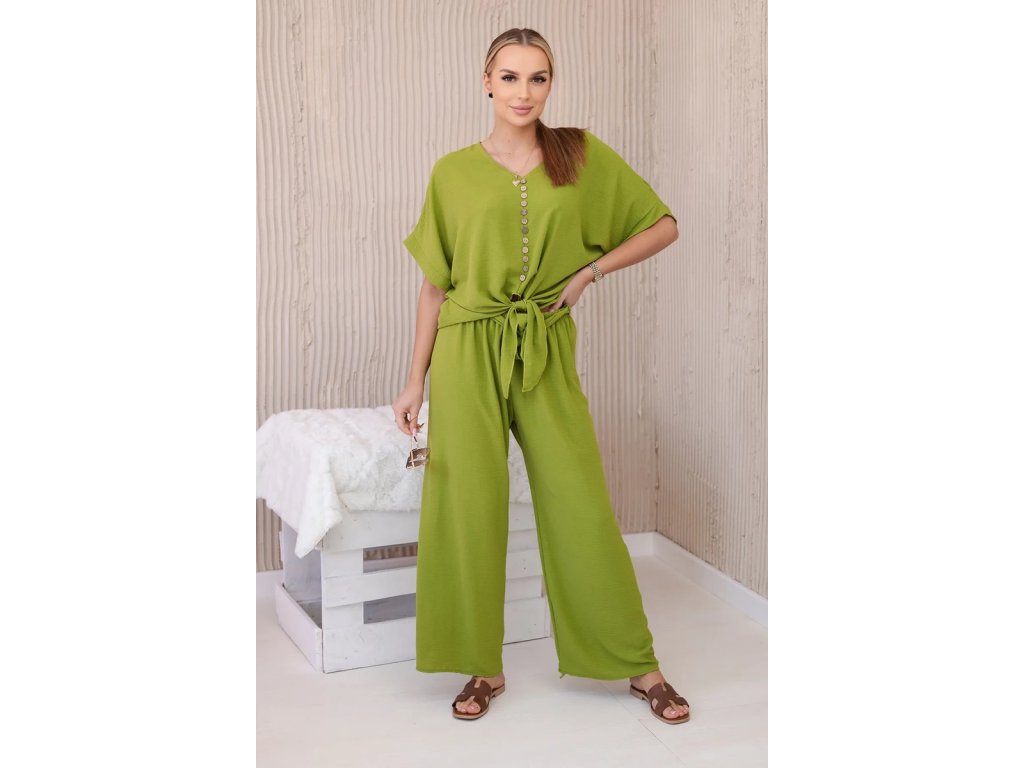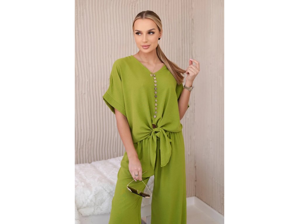 Objavte krásu letného štýlu s dámskym kompletom Omega! Tento trendy letný komplet tvoria široké nohavice s pohodlnou gumičkou v páse a štýlová blúzka s krátkymi rukávmi,véčkovým výstrihom, gombíkovou légou a viazaním na prednom diele. Ľahký a vzdušný materiál je ideálny do horúcich letných dní – je príjemný na pokožke, dobre saje pot a minimálne sa krčí.Tento moderný nohavicový komplet je perfektnou voľbou na cestovanie, výlety, dovolenku či bežné dni v meste. Dámsky letný komplet Omega vám zabezpečí maximálne pohodlie a zároveň štýlový vzhľad, nech ste kdekoľvek.