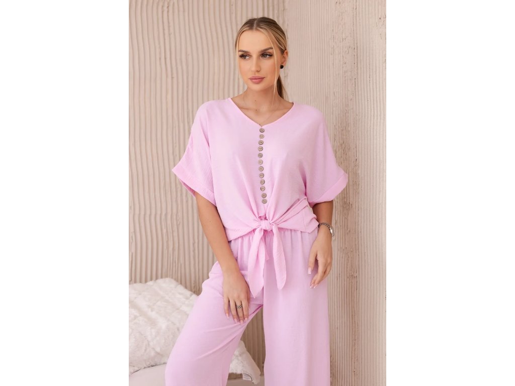 Objavte krásu letného štýlu s dámskym kompletom Omega! Tento trendy letný komplet tvoria široké nohavice s pohodlnou gumičkou v páse a štýlová blúzka s krátkymi rukávmi,véčkovým výstrihom, gombíkovou légou a viazaním na prednom diele. Ľahký a vzdušný materiál je ideálny do horúcich letných dní – je príjemný na pokožke, dobre saje pot a minimálne sa krčí.Tento moderný nohavicový komplet je perfektnou voľbou na cestovanie, výlety, dovolenku či bežné dni v meste. Dámsky letný komplet Omega vám zabezpečí maximálne pohodlie a zároveň štýlový vzhľad, nech ste kdekoľvek.