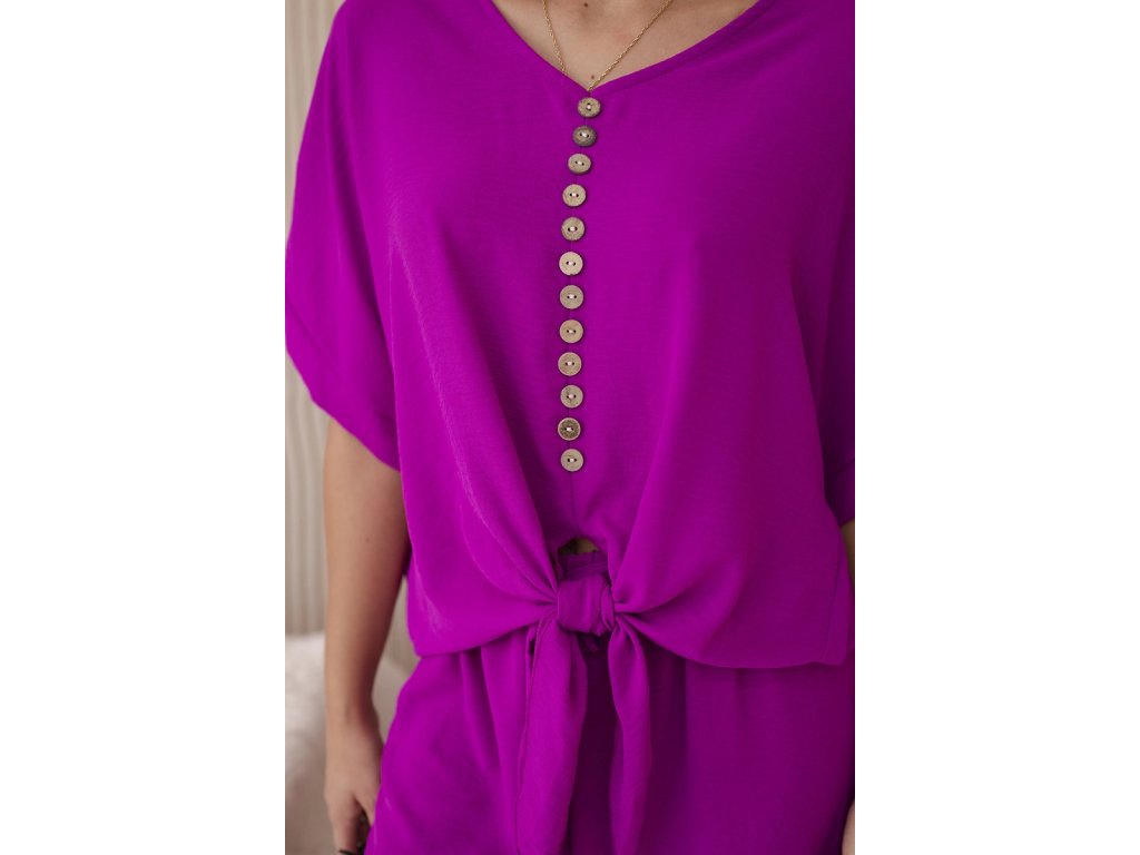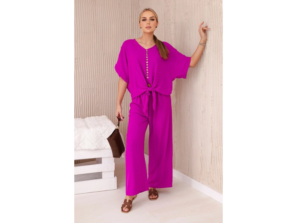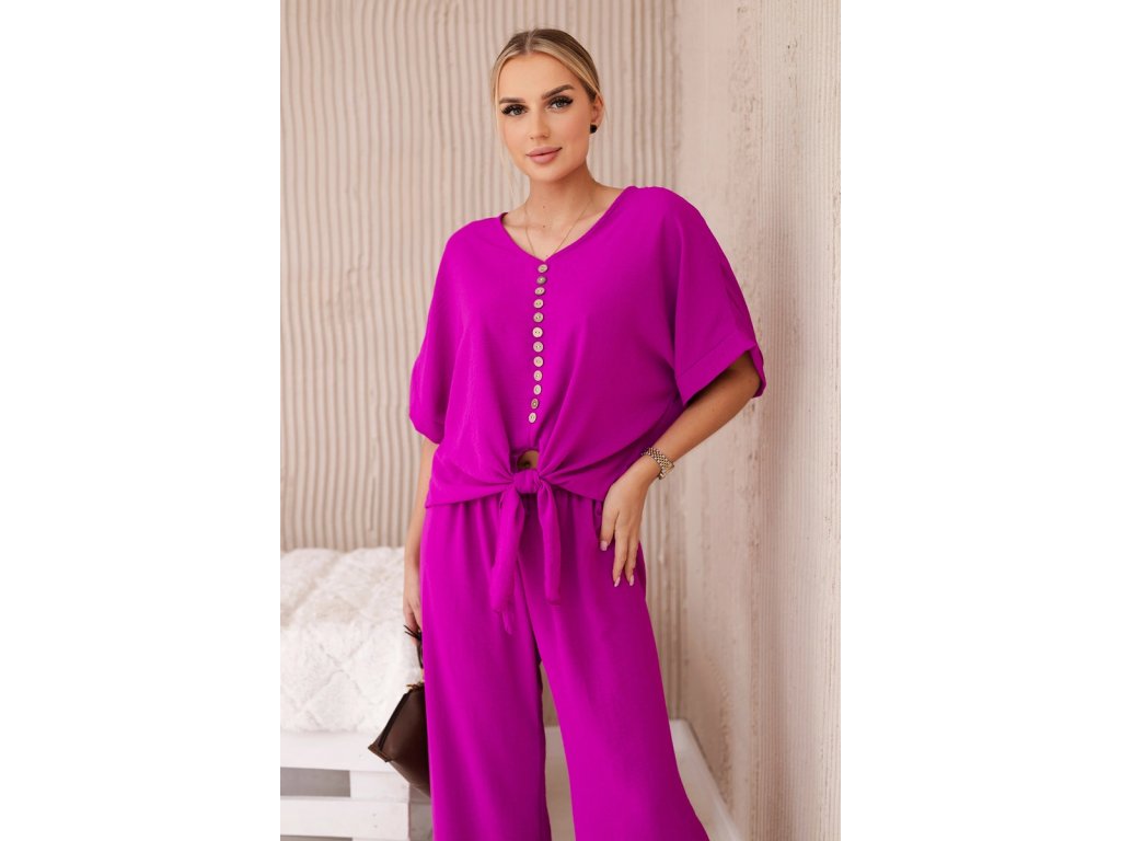 Objavte krásu letného štýlu s dámskym kompletom Omega! Tento trendy letný komplet tvoria široké nohavice s pohodlnou gumičkou v páse a štýlová blúzka s krátkymi rukávmi,véčkovým výstrihom, gombíkovou légou a viazaním na prednom diele. Ľahký a vzdušný materiál je ideálny do horúcich letných dní – je príjemný na pokožke, dobre saje pot a minimálne sa krčí.Tento moderný nohavicový komplet je perfektnou voľbou na cestovanie, výlety, dovolenku či bežné dni v meste. Dámsky letný komplet Omega vám zabezpečí maximálne pohodlie a zároveň štýlový vzhľad, nech ste kdekoľvek.