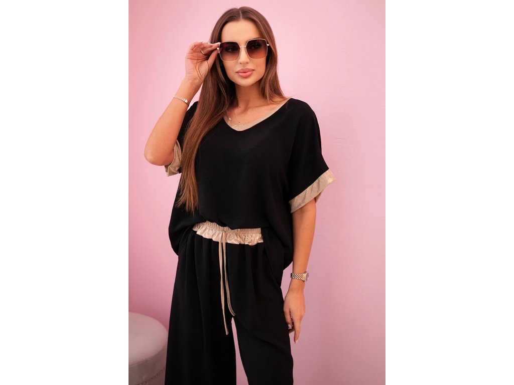 Objavte dokonalé spojenie komfortu a elegancie s dámskym letným kompletom Moriss, ktorý je ideálnou voľbou na horúce letné dni. Tento nohavicový komplet tvoria voľné ležérne nohavice s elastickým pásom na gumu pre maximálne pohodlie a oversize top s véčkovým výstrihom, ktorý pôsobí moderne a uvoľnene.Luxusný vzhľad kompletu podčiarkuje jemné zlaté lemovanie, ktoré dodáva outfitu šmrnc a výnimočný nádych elegancie. Ľahký, padavý viskózový materiál je príjemný na dotyk, vzdušný, chladivý a dobre saje pot, vďaka čomu sa v ňom budete cítiť komfortne počas celého dňa.