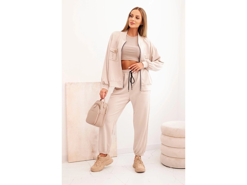 Celý komplet pôsobí ležérnym a uvoľneným dojmom, ktorý ešte zvýrazňujú dve náprsné vrecká na bunde ozdobené zlatým gombíkom. Vyrobený z ľahkého, vzdušného materiálu, je príjemný na pokožke a ideálny na celodenné nosenie.