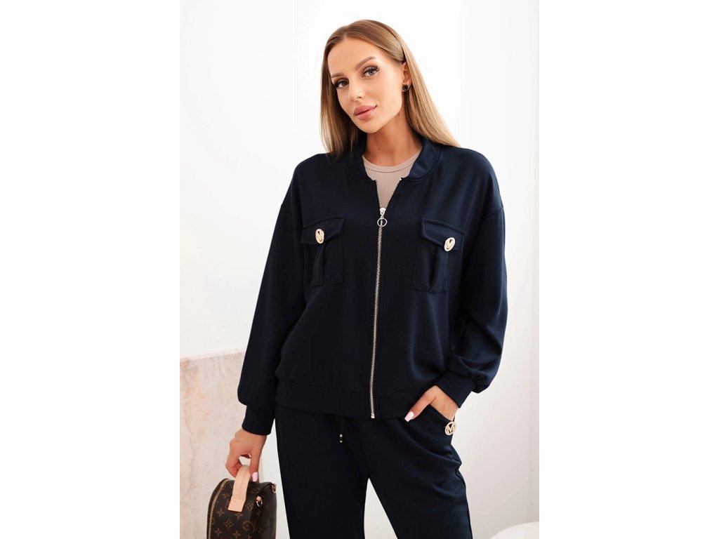 Celý komplet pôsobí ležérnym a uvoľneným dojmom, ktorý ešte zvýrazňujú dve náprsné vrecká na bunde ozdobené zlatým gombíkom. Vyrobený z ľahkého, vzdušného materiálu, je príjemný na pokožke a ideálny na celodenné nosenie.