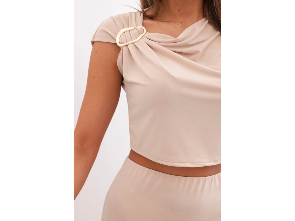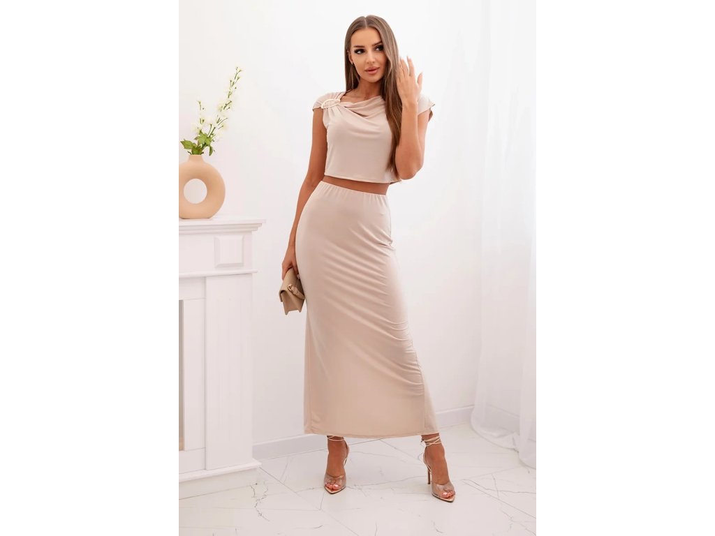 Moderný a štýlový dámsky sukňový komplet, ktorý zvýrazní ženskú siluetu a hodí sa na každodenné nosenie aj na elegantnejšie príležitosti. Horný diel tvorí blúzka s efektným vodopádovým výstrihom a ozdobnou sponou na ramene. Súčasťou kompletu je aj priliehavá dlhá sukňa s rozparkom vzadu, ktorý dodáva ľahkosť a voľnosť pohybu. Elastický materiál zabezpečuje pohodlie a prispôsobenie postave. Materiál je navyše príjemný k pokožke, dobre saje pot a vyžaduje minimálnu údržbul