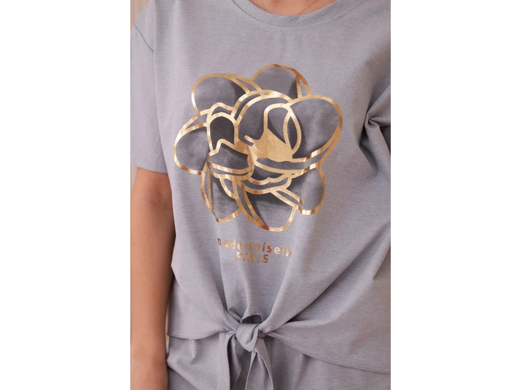 1. Štýlový dizajn: Šortky a top s viazaním na prednom diele vytvárajú dokonalú harmóniu štýlu a pohodlia.2. Unikátna zlatá potlač: Efektný kvetinový motív dodáva kompletu nádych luxusu a originality.