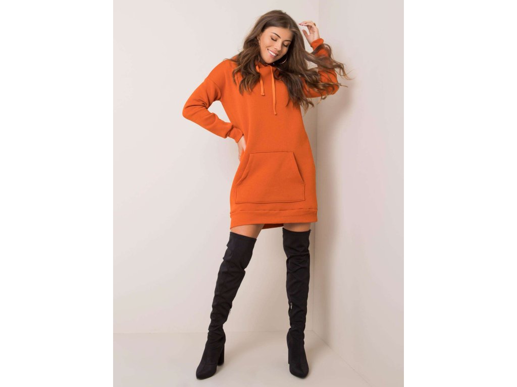 Dámska predĺžená klokanková mikina s kapucňou v oranžovej farbe. Mikina má klasický rovný strih, ktorý je na dolnom leme stiahnutý manžetou. Dĺžka mikiny siaha do polovice stehien. Na prednom diele nájdete jedno praktické klokankové vrecko. Je na vás, či model zvolíte ako športovo ladené šaty v oversize strihu, alebo ako predĺženú mikinu s legínami. Vďaka príjemnému bavlnenému materiálu a kvalitnému spracovaniu sa v tomto trendy kúsku vždy budete cítiť pohodlne a uvoľnene pri všetkých vaších aktivitách.