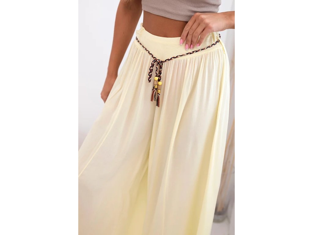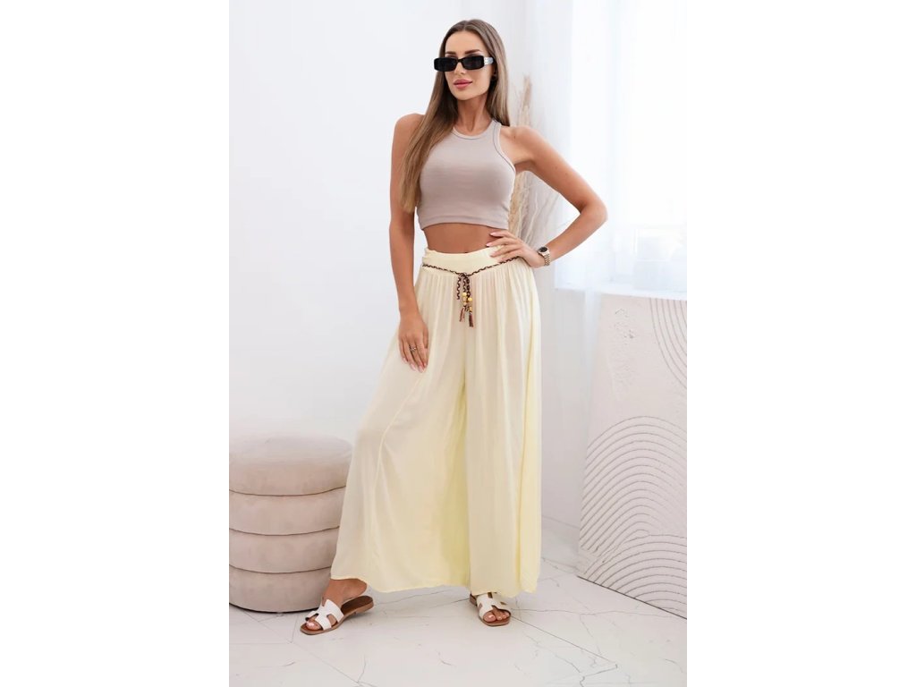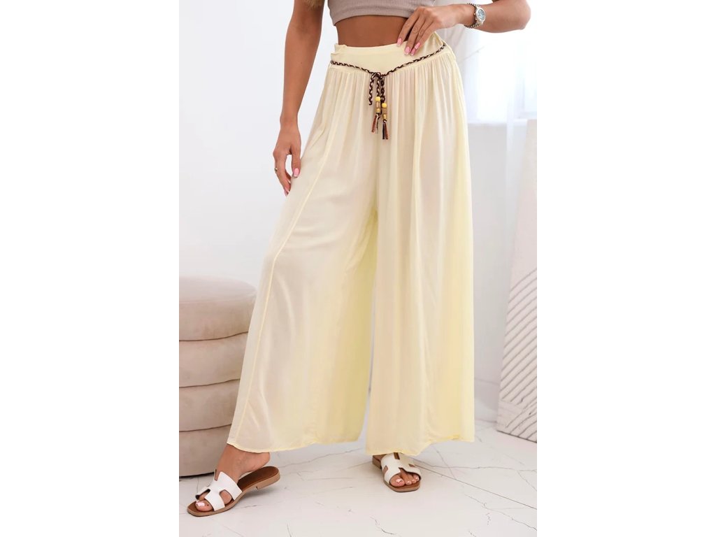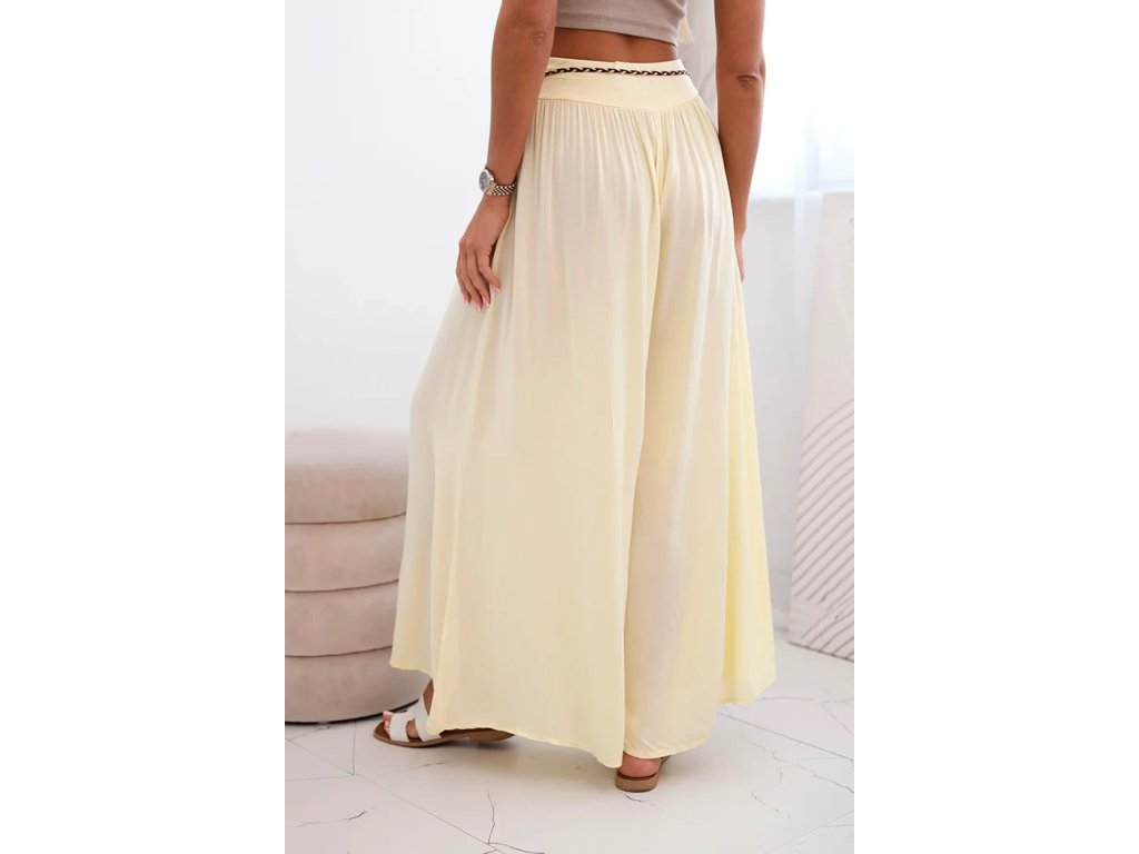 Doprajte si slobodu pohybu a jedinečný vzhľad. Oblečte si dámske široké nohavice Zellda, ktoré vás očaria svojim širokým strihom ako aj trendovým opaskom v boho štýle. Vďaka ich dizajnu vytvoria pôsobivý a zároveň pohodlný letný outfit.Tieto široké letné nohavice majú široký pás s jemným riasením, ktorý sa krásne prispôsobí postave a zabezpečí komfort počas celého dňa. Letné nohavice Zellda sú ušité z ľahkej, vzdušnej viskózy, ktorá je príjemná k pokožke, dobre saje pot a len minimálne sa krčí.