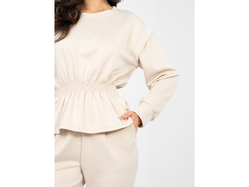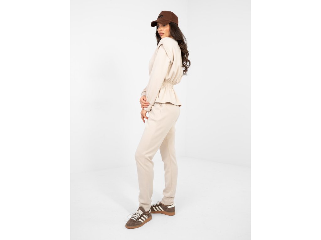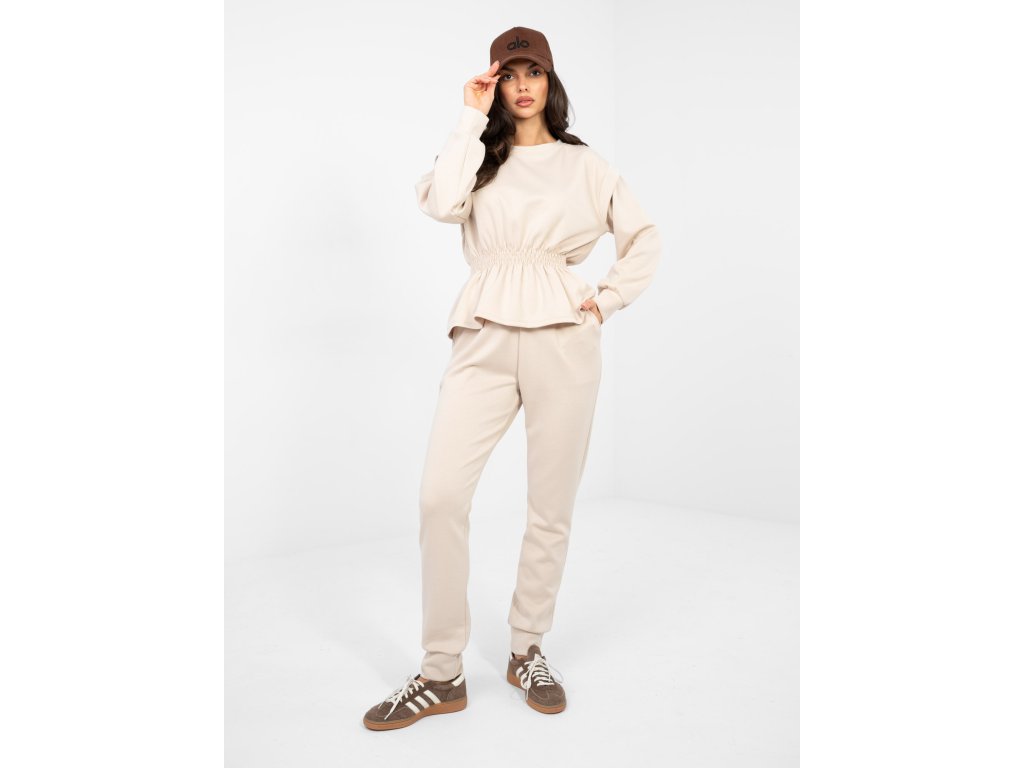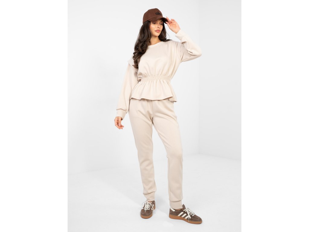 Doprajte si pocit absolútnej slobody bez kompromisov v štýle s dámskym kompletom Doty. Tento ležérny komplet tvoria dokonale padnúce tepláky a unikátna mikina v modernej dĺžke do pása. Top je pod prsiami rafinovane riasený gumičkou, čo krásne definuje postavu, zatiaľ čo dolný lem ozvláštnený nežným volánom dodáva celému outfitu ženský a hravý nádych. Okrúhly výstrih a materiál, ktorý je mimoriadne jemný k pokožke, zaručujú, že sa v ňom budete cítiť skvele od rána až do večera.