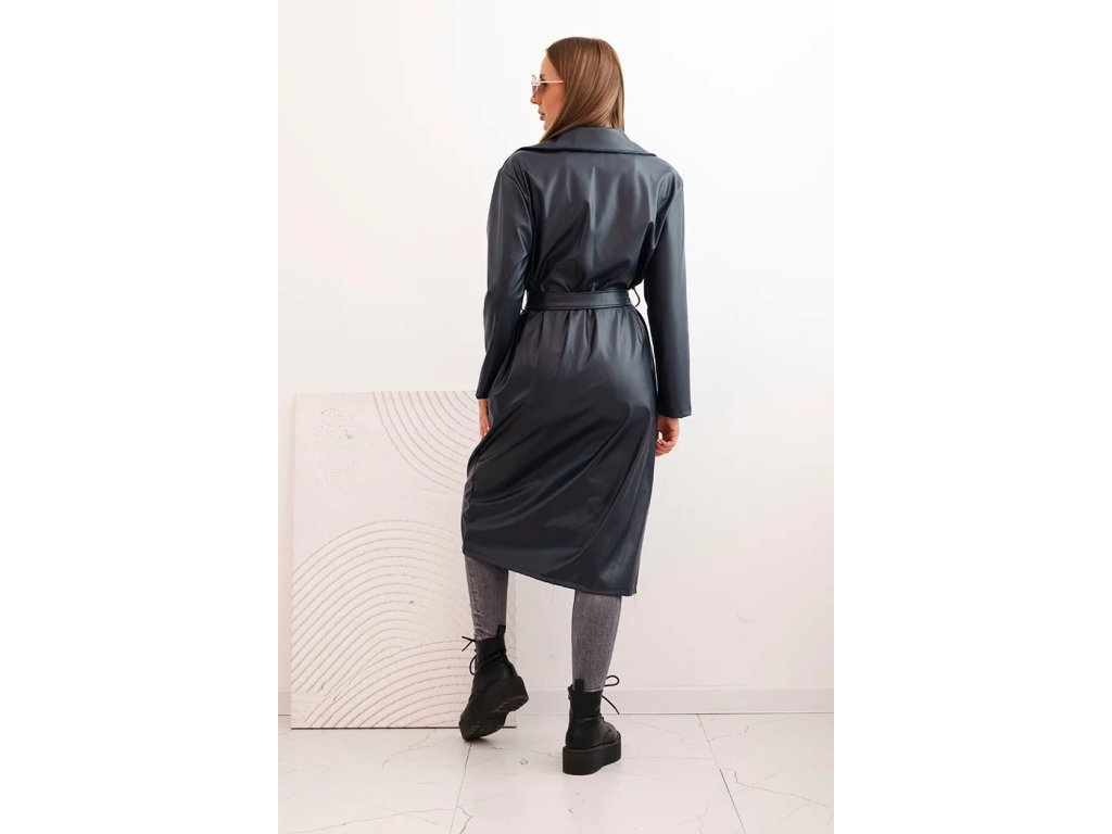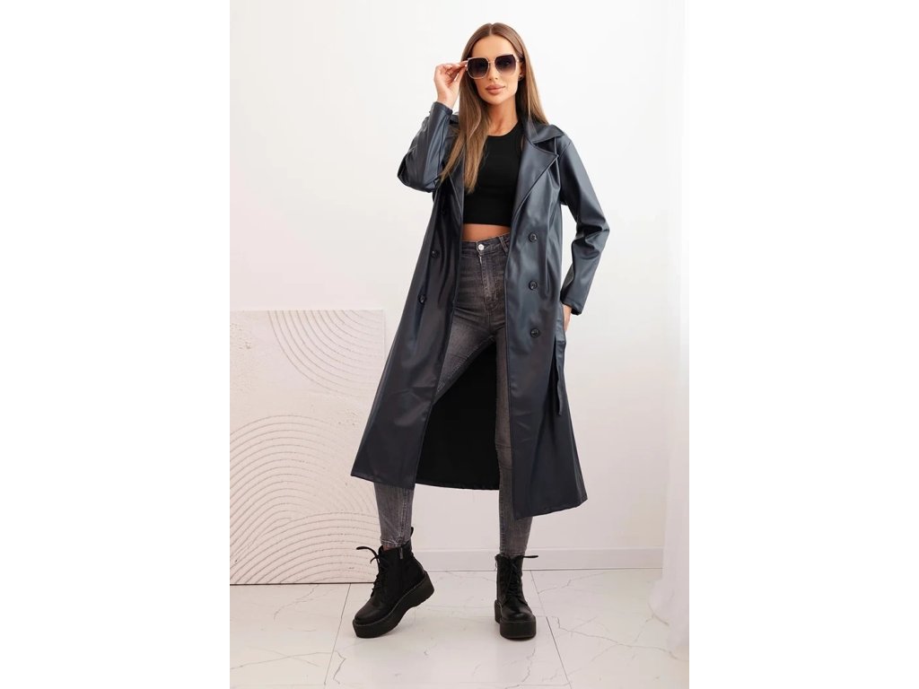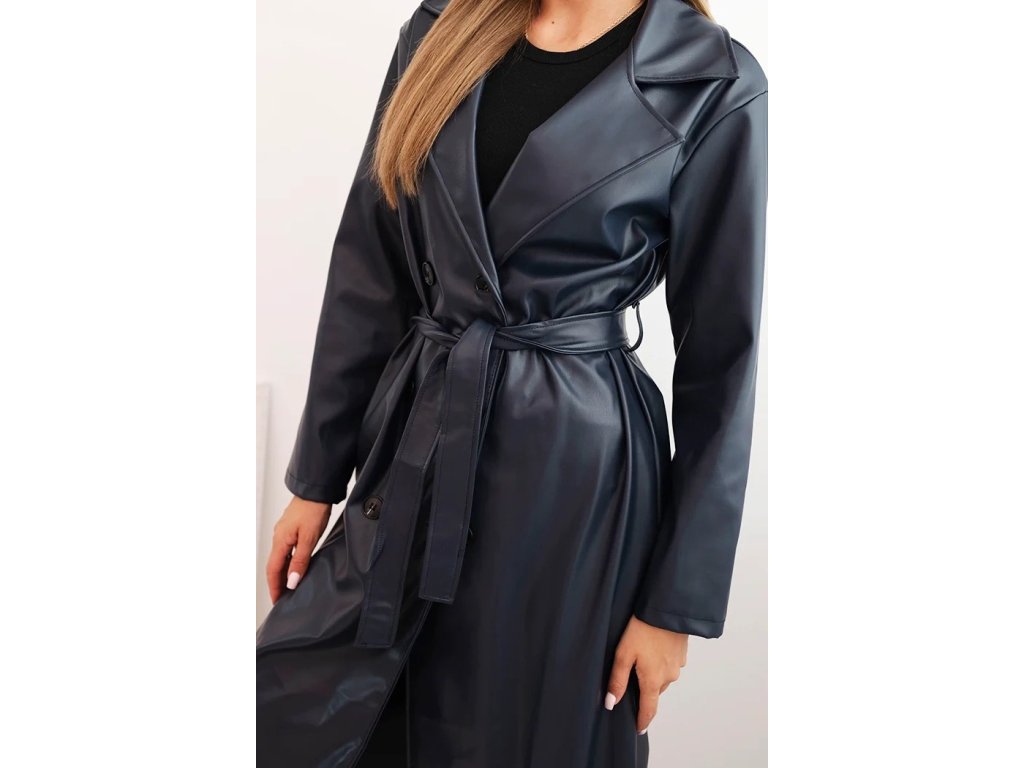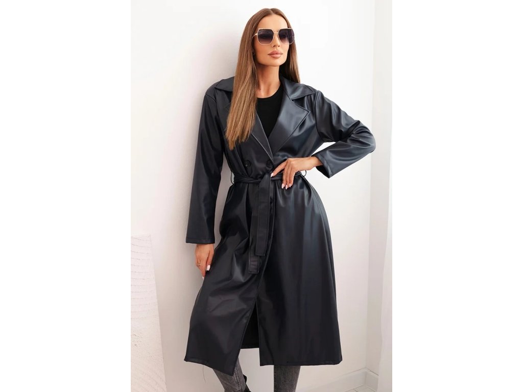 Kabát je vybavený dvojradovým zapínaním, véčkovým výstrihom s golierom a praktickým viazaním v páse, ktoré krásne zvýrazní ženskú siluetu. Dve bočné vrecká pridávajú funkčnosť a komfort, zatiaľ čo jemná eko koža s realistickým vzhľadom pripomína pravú kožu.