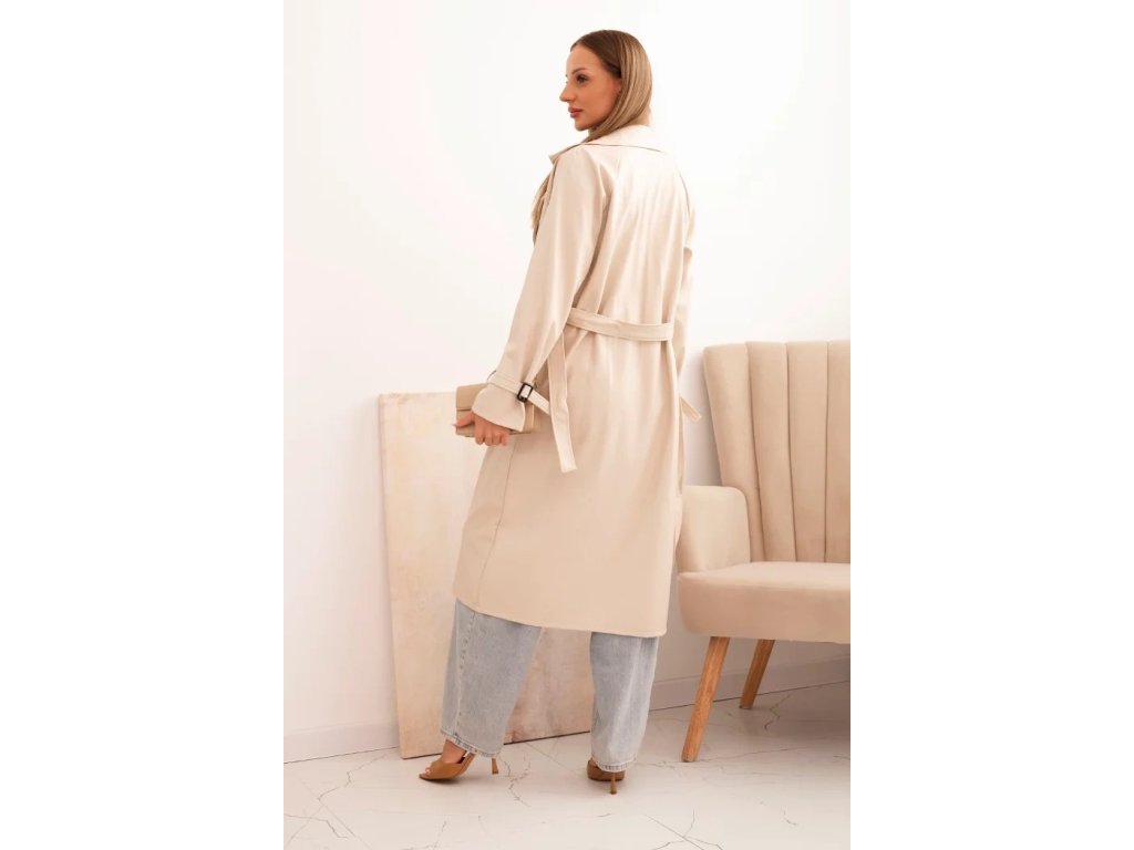 Dámsky trenčkot z eko kože Momis je nadčasový a elegantný kúsok, ktorý nesmie chýbať vo vašom šatníku. Tento dámsky kabát v midi dĺžke pod kolená je navrhnutý v klasickom trenčkotovom štýle – má véčkový výstrih s klopom, dvojradové zapínanie a opasok na viazanie v páse, ktorý krásne zvýrazní postavu. Nechýbajú ani praktické bočné vrecká.Kabát je podšitý, vďaka čomu je ideálny na prechodné obdobie – využijete ho počas jesenných aj jarných dní. Vďaka kvalitnej eko koži pôsobí luxusne a ľahko sa kombinuje s rôznymi kúskami oblečenia. Skvelo sa hodí k nohaviciam, rifliam aj šatám.