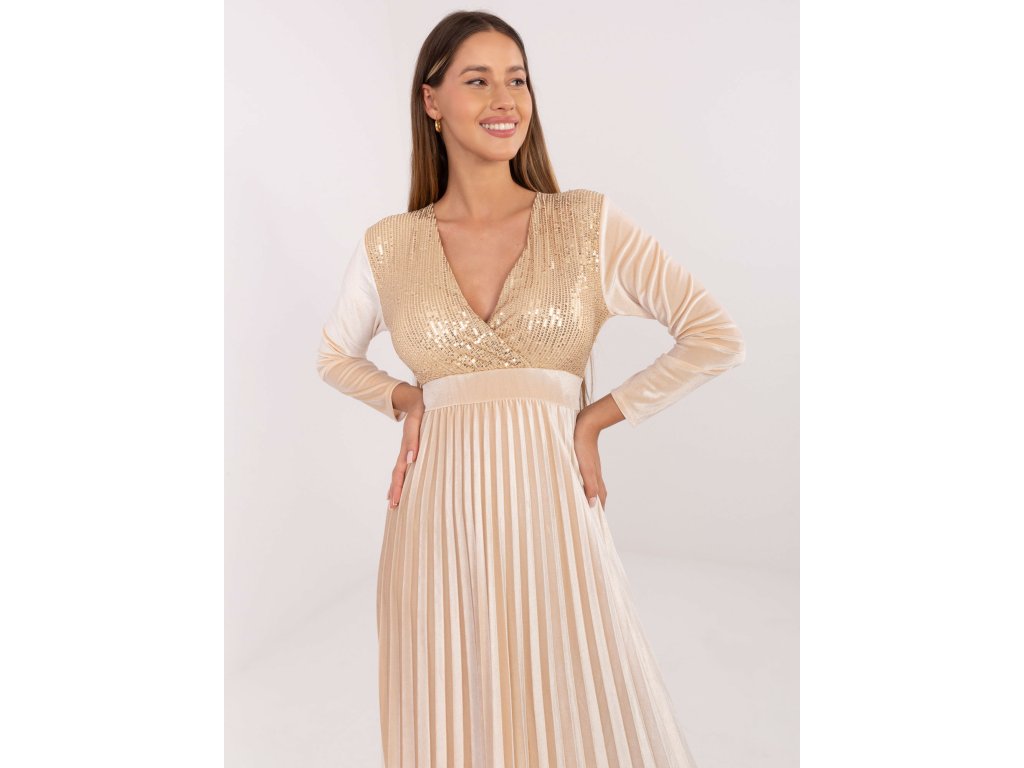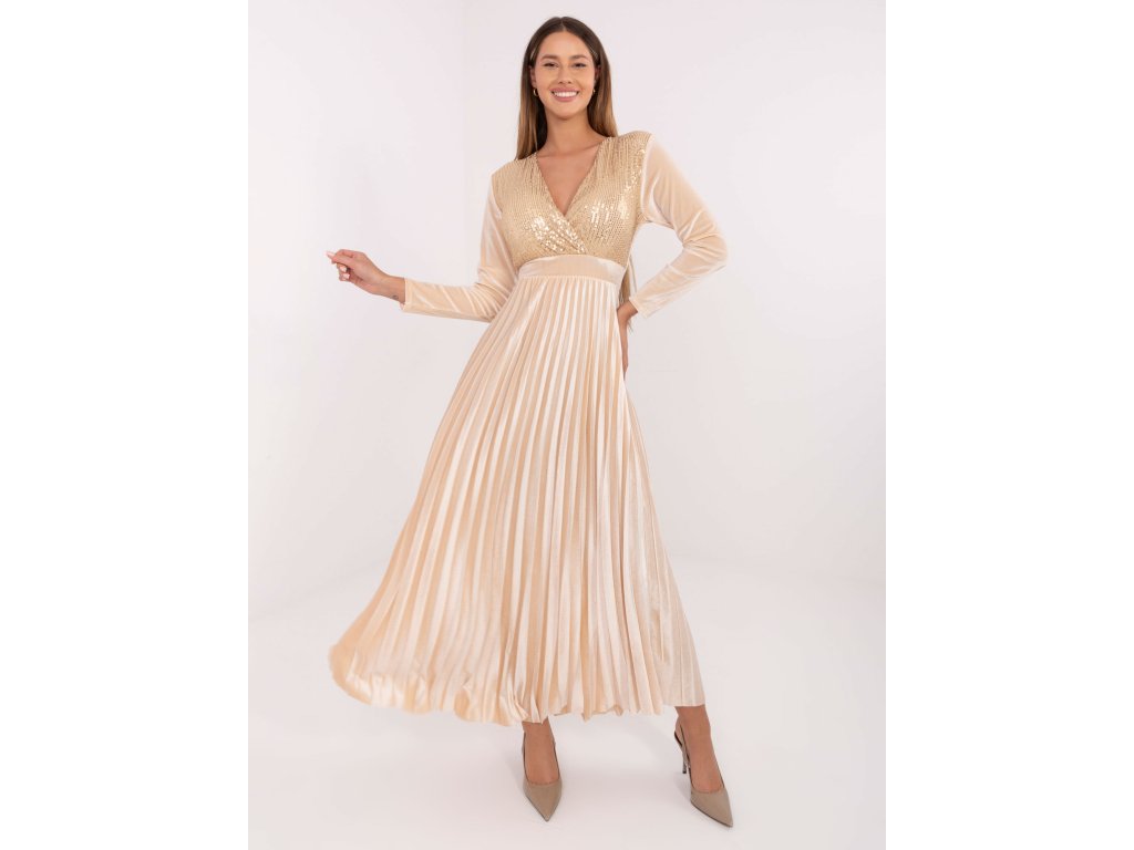 Dámske elegantné šaty Azan sú dokonalou kombináciou elegancie, ženskosti a moderného lesku. Vrchný flitrovaný top dodáva šatám glam efekt, zatiaľ čo véčkový zavinovací výstrih krásne zvýrazní dekolt a lichotí každej postave.Šaty majú dlhé rukávy, ktoré pôsobia decentne a dodávajú modelu harmonický, vyvážený vzhľad. Spodná časť je tvorená nádhernou plisovanou sukňou v áčkovom strihu, ktorá pri chôdzi elegantne splýva a pôsobí mimoriadne žensky.