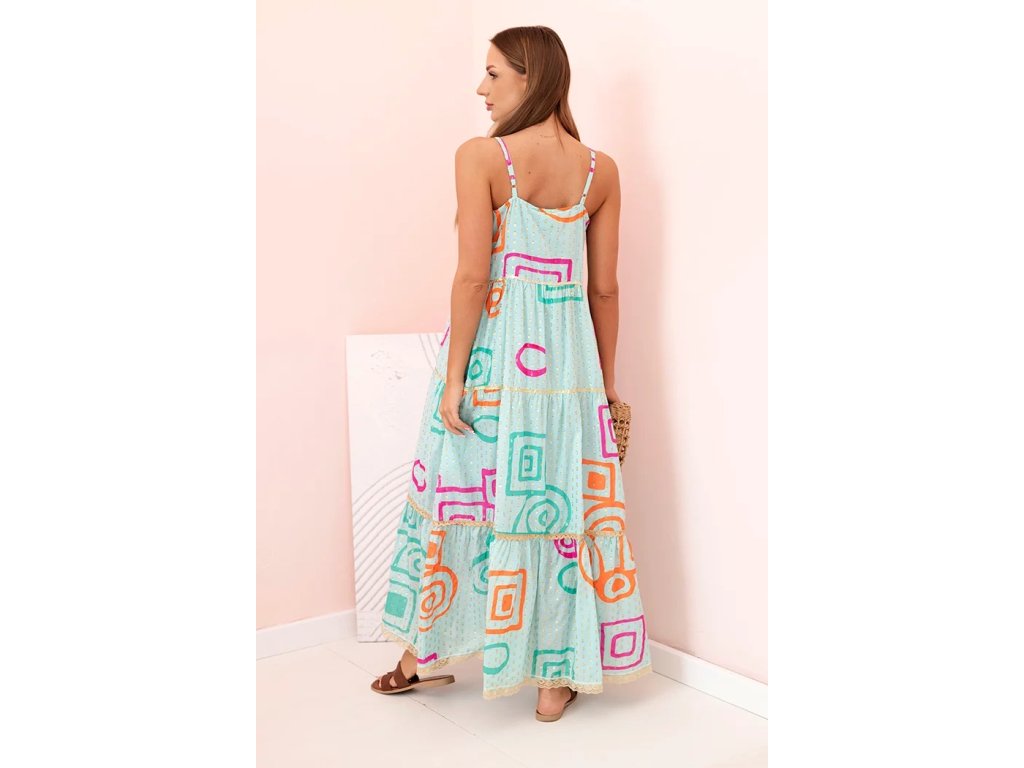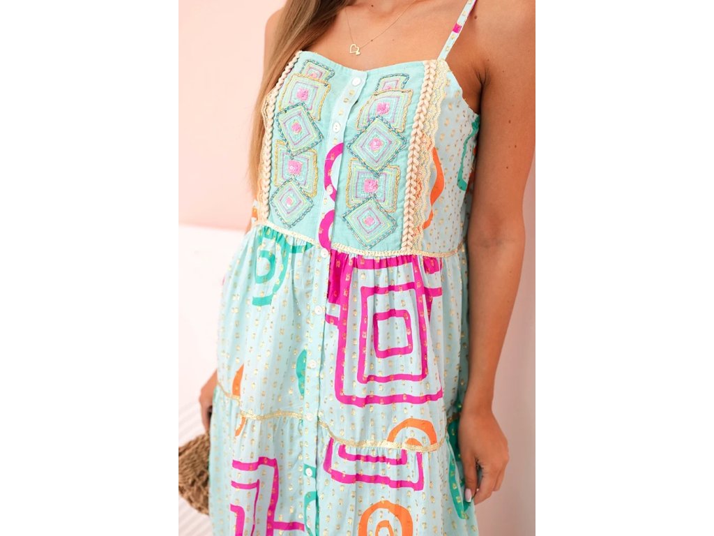 Doprajte si komfort a výnimočný vzhľad v šatách, ktoré dokonale vystihujú atmosféru letných dní. Dámske letné šaty Itara sú navrhnuté v ľahkom áčkovom strihu, ktorý lichotí postave a zaručuje voľnosť pohybu. Tenké ramienka, praktické gombíkové zapínanie vpredu a výrazná geometrická potlač robia z týchto šiat jedinečný kúsok, ktorý si zamilujete na prvý pohľad.Vyšívané detaily dodávajú modelu nádych remeselnej elegancie a robia z týchto letných šiat originálny a neopozeraný outfit. Ľahučký, vzdušný materiál je ideálny na horúce letné dni, skvele sa nosí a príjemne chladí. Tieto dlhé letné šaty sú perfektnou voľbou na dovolenku, výlety, letné festivaly či potulky mestom.