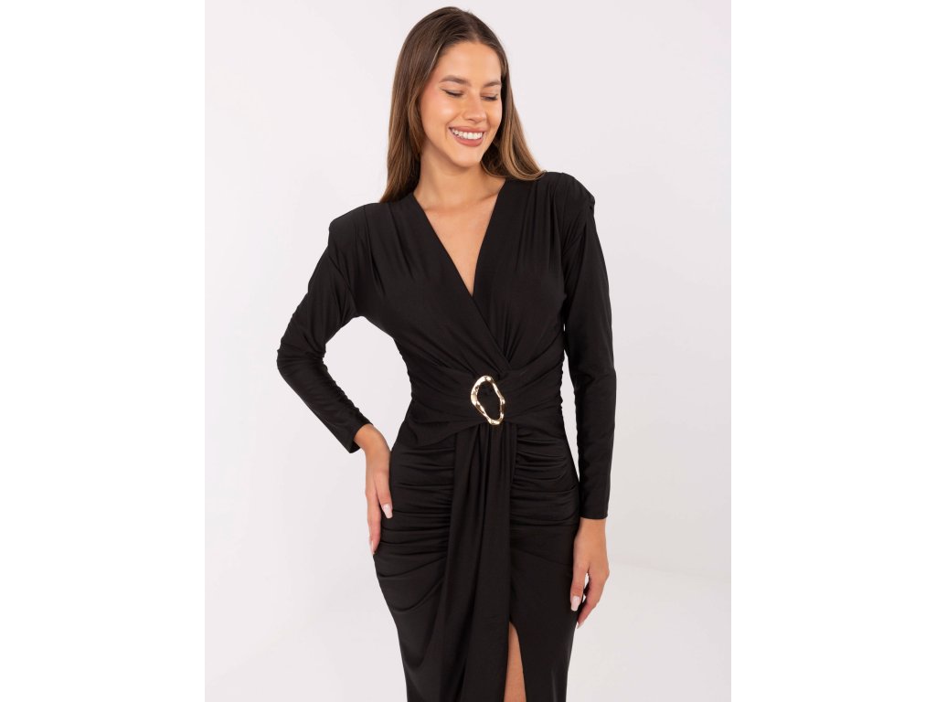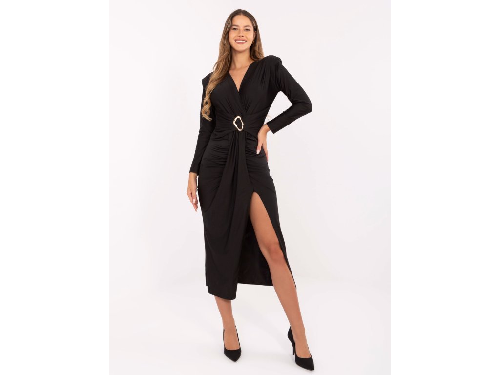 Šaty majú midi dĺžku pod kolená, ktorá lichotí postave, a efektný rozparok, ktorý dodáva modelu zvodný, ale stále elegantný charakter. Véčkový výstrih ukončený zlatou sponou krásne priťahuje pozornosť a pôsobí luxusným dojmom.