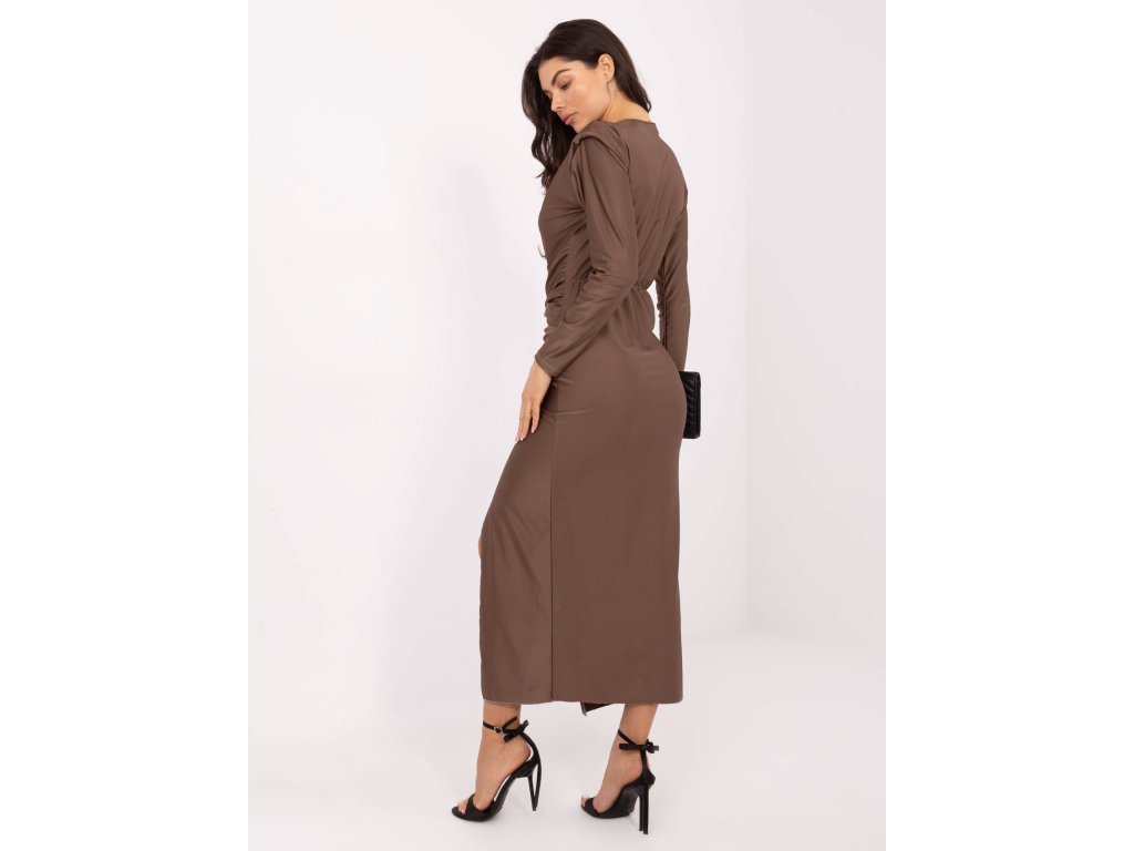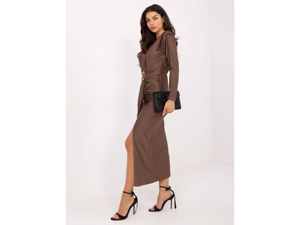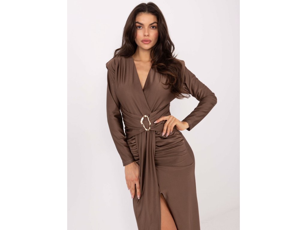 Šaty majú midi dĺžku pod kolená, ktorá lichotí postave, a efektný rozparok, ktorý dodáva modelu zvodný, ale stále elegantný charakter. Véčkový výstrih ukončený zlatou sponou krásne priťahuje pozornosť a pôsobí luxusným dojmom.