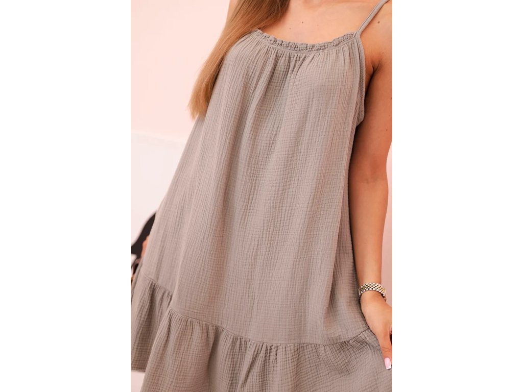 Objavte ľahkosť letných dní s dámskymi letnými šatami na ramienka Pozana, ktoré spájajú jednoduchosť, pohodlie a nežný romantický detail. Letné šaty v dĺžke po kolená majú áčkový strih, ktorý lichotí postave a poskytuje voľnosť pohybu. Ich dolný lem zdobí jemný volán, ktorý dodáva modelu hravý a ženský výraz.Tieto letné šaty na ramienka sú ušité z ľahkého vzdušného bavlneného mušelínu, ktorý je príjemný na pokožke, dobre saje pot a zabezpečí vám komfort aj počas horúcich letných dní. Ich minimalistický dizajn z nich robí univerzálny kúsok pre každý deň.