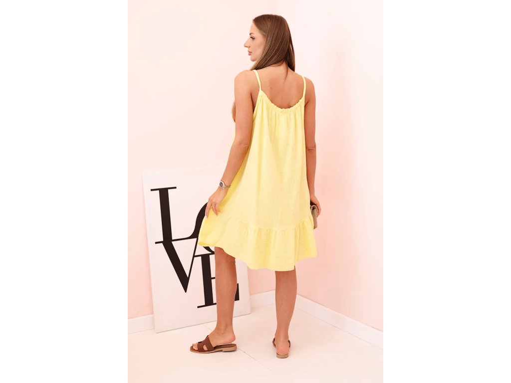 Objavte ľahkosť letných dní s dámskymi letnými šatami na ramienka Pozana, ktoré spájajú jednoduchosť, pohodlie a nežný romantický detail. Letné šaty v dĺžke po kolená majú áčkový strih, ktorý lichotí postave a poskytuje voľnosť pohybu. Ich dolný lem zdobí jemný volán, ktorý dodáva modelu hravý a ženský výraz.Tieto letné šaty na ramienka sú ušité z ľahkého vzdušného bavlneného mušelínu, ktorý je príjemný na pokožke, dobre saje pot a zabezpečí vám komfort aj počas horúcich letných dní. Ich minimalistický dizajn z nich robí univerzálny kúsok pre každý deň.