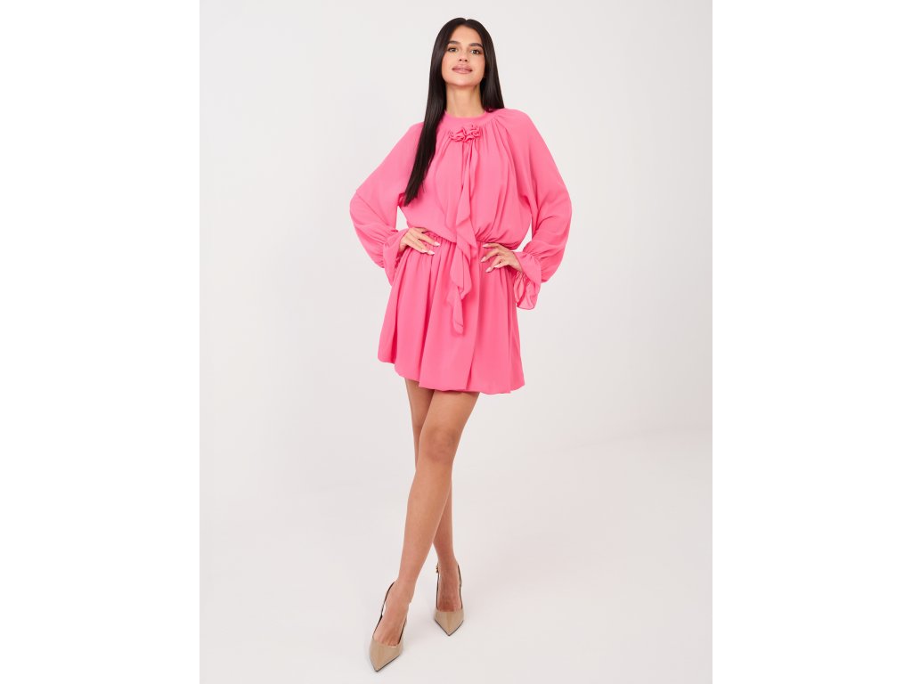 Elegantné áčkové šaty s volánom Tubin sú romantickým a ženským kúskom, ktorý rozžiari každý váš outfit. Šaty v áčkovom strihu a midi dĺžke po kolená majú voľný riasený strih, ktorý dodáva šatám jemný pohyb a elegantný vzhľad. Žabó a kvetinová aplikácia na dekolte podčiarkujú ich nežný a sofistikovaný charakter.Voľné rukávy sú na koncoch stiahnuté gumičkou, rovnako ako aj pás, čo jemne zvýrazní postavu a zachová komfortné nosenie. Šaty sú vyrobené z ľahkej viskózy, ktorá vám zaručí pohodlie a slobodu pohybu.