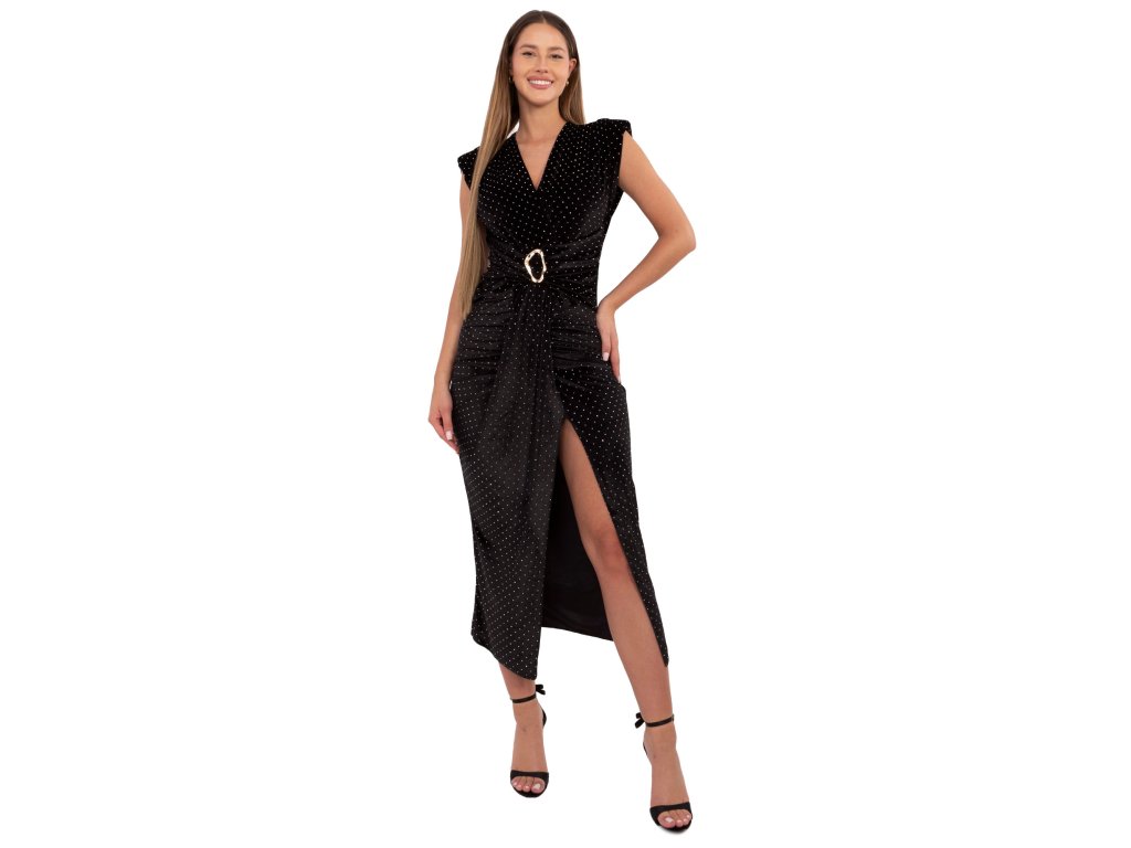 Šaty majú midi dĺžku pod kolená, ktorá lichotí postave, a efektný rozparok, ktorý dodáva modelu zvodný, ale stále elegantný charakter. Véčkový výstrih ukončený zlatou sponou krásne priťahuje pozornosť a pôsobí luxusným dojmom.