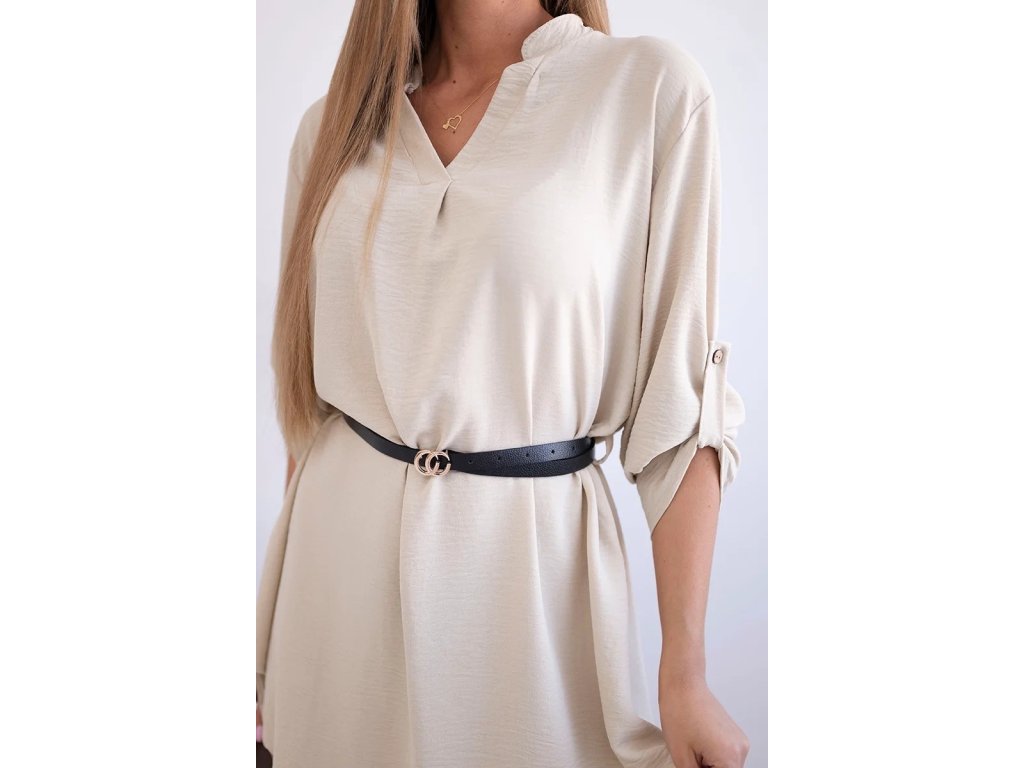 Dámske košeľové šaty Stela sú presne tým kúskom, ktorý Vám dodá pocit ženskosti, voľnosti a moderného štýlu v každej situácii. Mini dĺžka do polovice stehien pôsobí sviežo a mladistvo, zatiaľ čo véčkový výstrih a opasok v páse krásne zvýraznia siluetu bez toho, aby šaty pôsobili príliš formálne. Voľný strih je pohodlný, vzdušný a lichotivý pre postavu.Dlhé rukávy si môžete jednoducho podhrnúť a zopnúť na 3/4 dĺžku, vďaka čomu si šaty prispôsobíte podľa počasia aj nálady. Oblúkovito strihaný dolný lem a mierne predĺžená zadná časť dodávajú modelu moderný a premyslený vzhľad. Materiál je ľahký, vzdušný a minimálne krčivý – ideálny na celodenné nosenie.