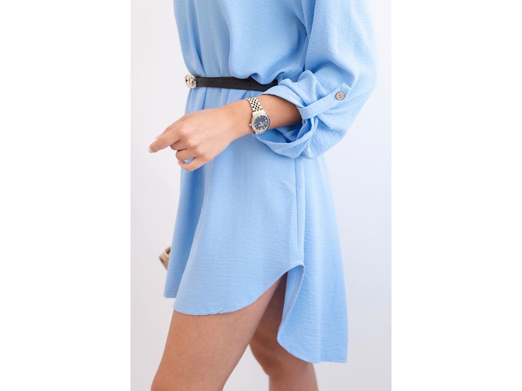 Dlhé rukávy si môžete jednoducho podhrnúť a zopnúť na 3/4 dĺžku, vďaka čomu si šaty prispôsobíte podľa počasia aj nálady. Oblúkovito strihaný dolný lem a mierne predĺžená zadná časť dodávajú modelu moderný a premyslený vzhľad. Materiál je ľahký, vzdušný a minimálne krčivý – ideálny na celodenné nosenie.