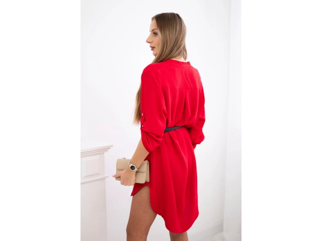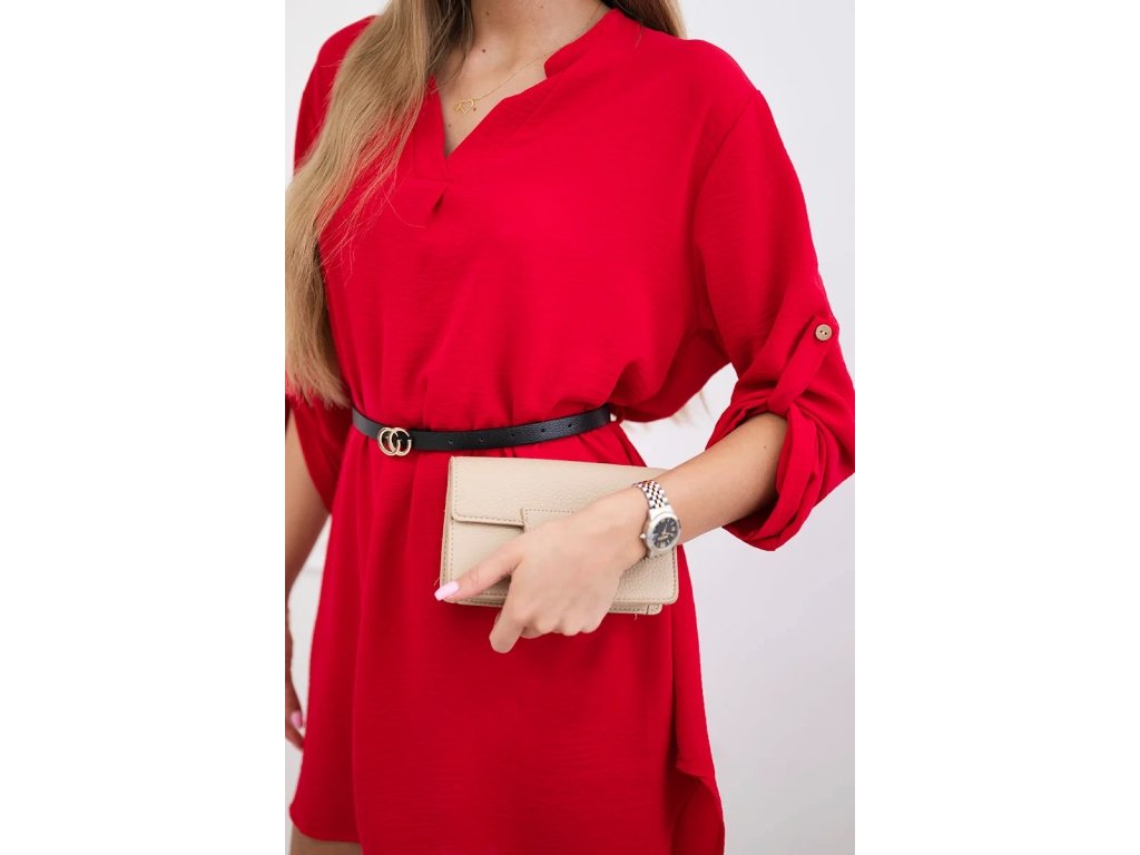 Dámske košeľové šaty Stela sú presne tým kúskom, ktorý Vám dodá pocit ženskosti, voľnosti a moderného štýlu v každej situácii. Mini dĺžka do polovice stehien pôsobí sviežo a mladistvo, zatiaľ čo véčkový výstrih a opasok v páse krásne zvýraznia siluetu bez toho, aby šaty pôsobili príliš formálne. Voľný strih je pohodlný, vzdušný a lichotivý pre postavu.Dlhé rukávy si môžete jednoducho podhrnúť a zopnúť na 3/4 dĺžku, vďaka čomu si šaty prispôsobíte podľa počasia aj nálady. Oblúkovito strihaný dolný lem a mierne predĺžená zadná časť dodávajú modelu moderný a premyslený vzhľad. Materiál je ľahký, vzdušný a minimálne krčivý – ideálny na celodenné nosenie.