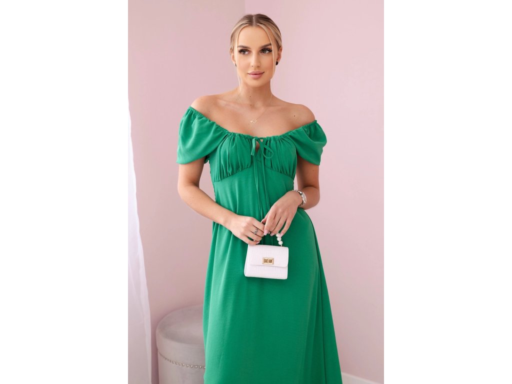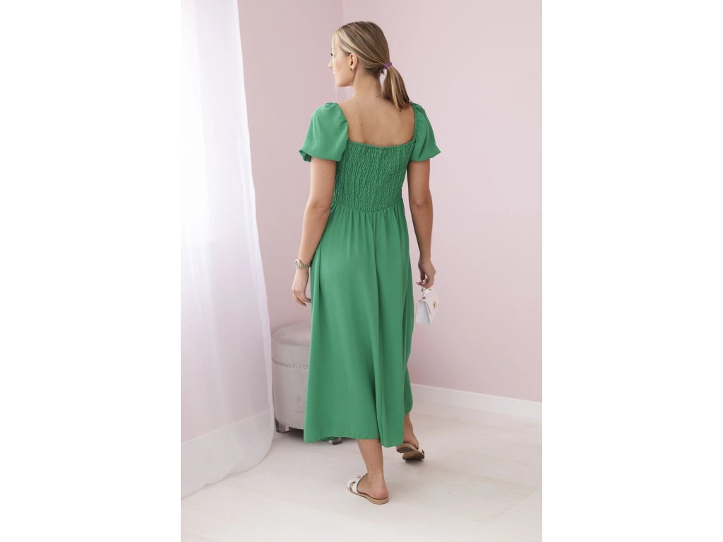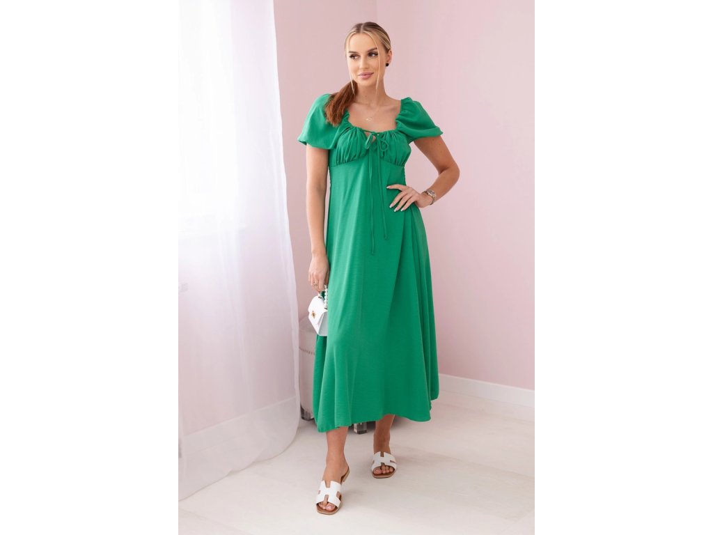 Tieto letné midi šatymajú krásne ženské prevedenie. Áčkový strih šiat s voľnou sukňou, dokonale dopĺňa hlbší riasený výstrih doplnený viazačkou. Zaväzovanie vo výstrihu umožňuje prispôsobiť hĺbku výstrihu vašim individuálnym preferenciám. Tento strih navyše opticky zväčšuje poprsie, čo môžete využiť ak potrebujete zväčšiť tieto partie. Krátke rukávy jemne zahaľujú ramená a riasenie na chrbte zabezpečí pohodlné nosenie a jemný šarm, pričom zvýrazňuje pás. Áčkový strih krásne lichotí ženskej postave a dodá jemnosť a sofistikovanosť každému stylingu.Tieto efektné áčkové šaty sú vyrobené z kvalitných materiálov a sú pohodlné na celodenné nosenie. Midi dĺžka navyše pristane takmer každej žene a je vhodná na rôzne príležitosti.