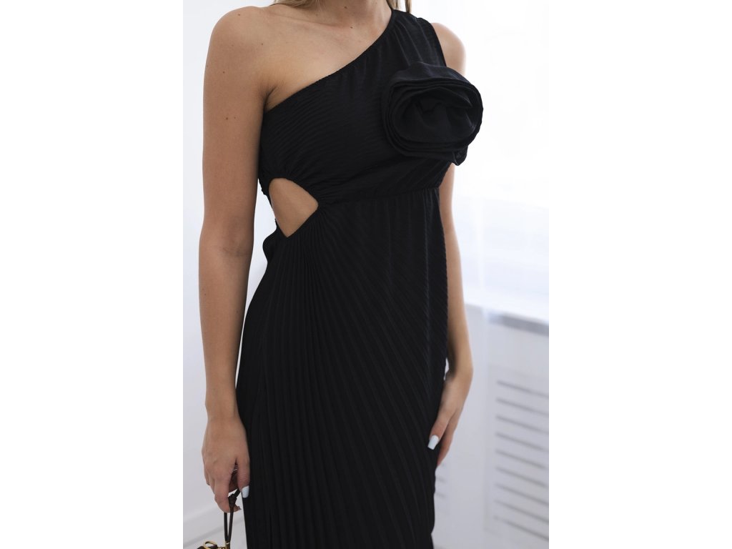 Tieto elegantné šaty majú asymetrický strih na jedno ramienko a šikmo strihanú plisovanú sukňu, ktorá iba podčiarkuje netradičný ráz celého modelu. Ozdobný kvet umiestnený na výstrihu dodáva šatám jedinečný šarm a výraznosť. V páse všitá gumička zabezpečí pohodlné nosenie. Tieto plisované šaty sú vyrobené z ľahkého, vzdušného materiálu a ich jemné záhyby na sukni, zabezpečia ľahkosť, ktorá sa dokonale prejaví pri pohybe. Praktická midi dĺžka sa hodí viacerým typom postáv a na množstvo príležitostí.- O tom ako vybrať a nosiť midi šaty tak, aby ste využili ich potenciál sa dozviete v článku na našom blogu.