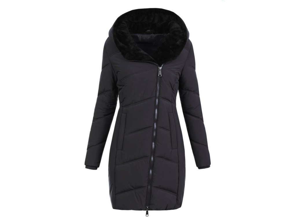 Nekompromisný hit tejto sezóny. To je dámska zimná bunda s kapucňou s netradičným šikmým zapínaním. Bunda zaujme práve svojim originálnym prevedením a elegantným vzhľadom. Čierna farba elegantný dojem iba podčiarkuje.