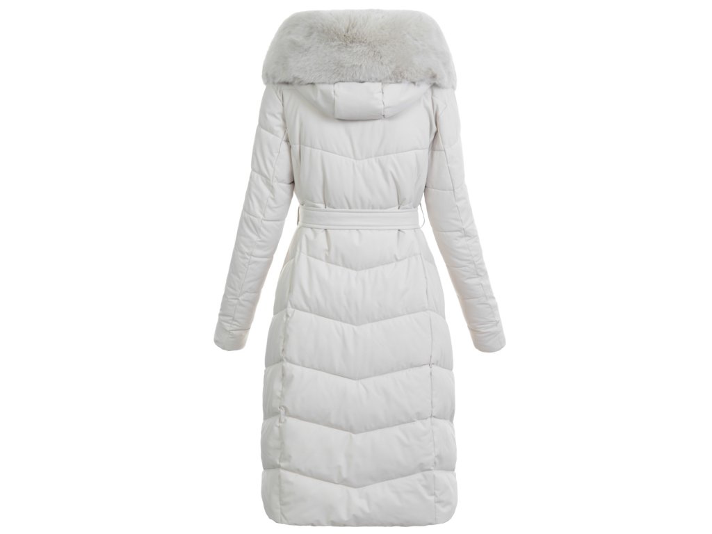 Bunda má veľkú kapucňu pevne prišitú k bunde, lemovanú bohatým kožušinovým lemom, ktorý elegantne prechádza pozdĺž celého zipsu. Tento kožušinový lem je možné odopnúť, takže si bundu prispôsobíte podľa svojho štýlu či príležitosti. Jemný lesk a detaily dodávajú modelu nádych luxusu a elegancie.