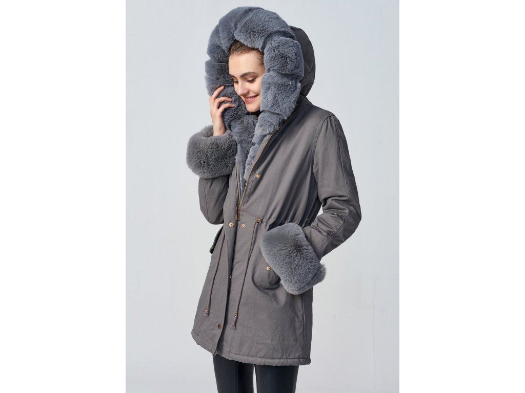 Luxusná dámska zimná bunda typu parka v obľúbenej šedej zelenej. Bunda je vo vnútornej časti oteplená šedou kožušinovou vložkou, ktorá nielen dobre vyzerá ale hlavne príjemne zahreje v chladnom počasí. Oteplená kožúškom je stredná časť bundy vrátane kapucne.