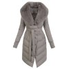 Bunda má asymetrický strih s dvojradovým zapínaním na gombíky, čo jej dodáva originálny a luxusný vzhľad. Dlhé rukávy sú ukončené širokou manžetou a priečne prešívanie krásne tvaruje postavu bez zbytočného rozširovania. Dĺžka po kolená a viazanie v páse látkovým opaskom zvýraznia ženské krivky a dodajú bunde eleganciu.