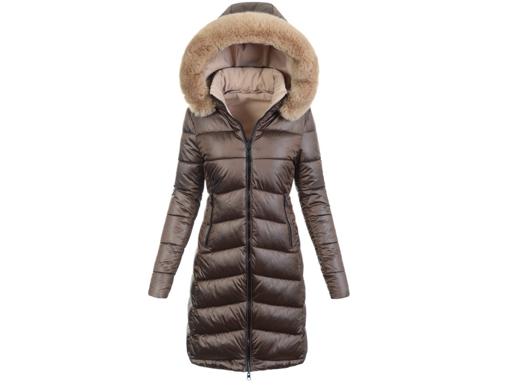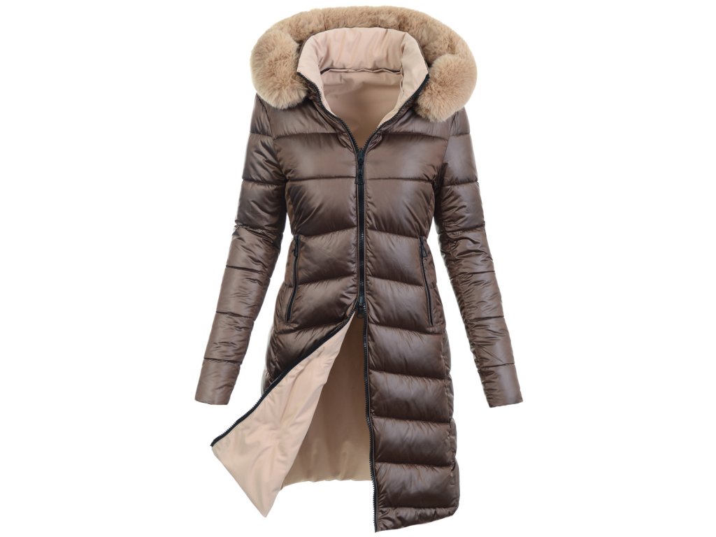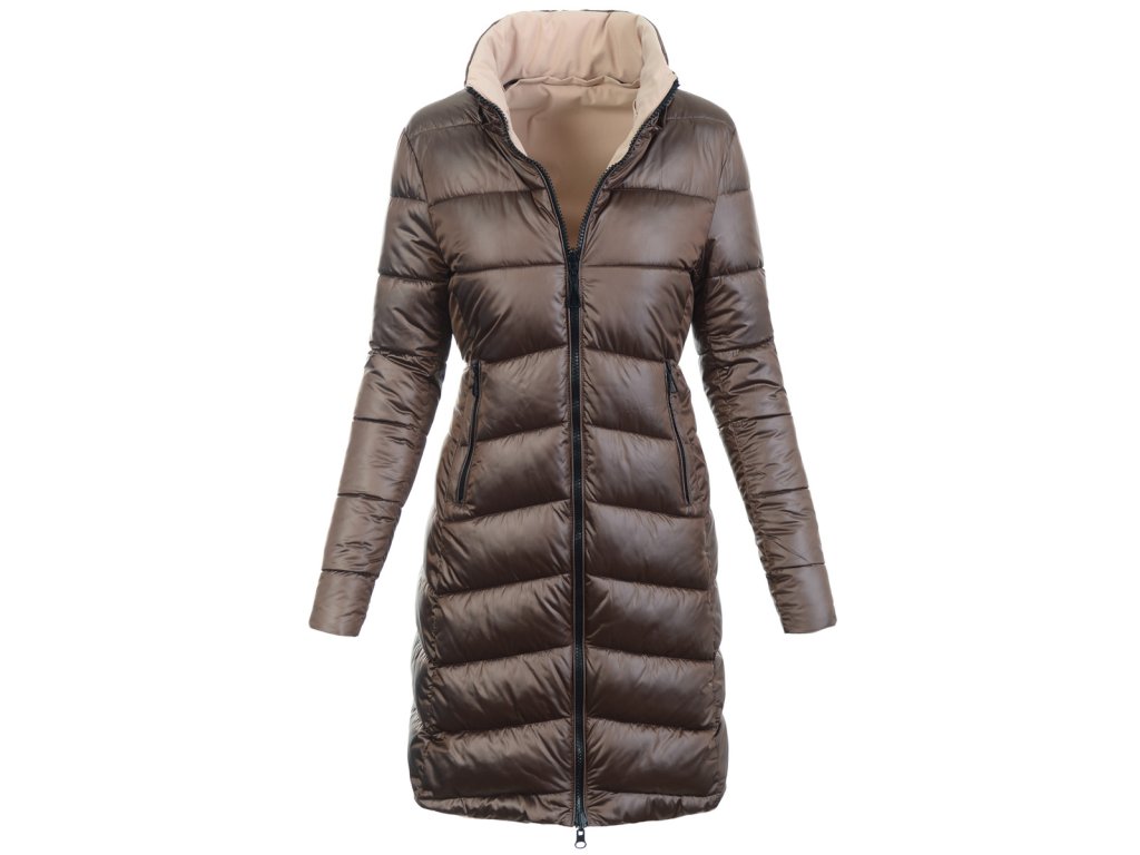 obojstranná dámska zimná bunda Lora hnedá - elegantná dlhá zimná bunda s kapucňou