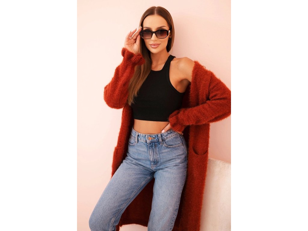 Dámsky moherový kardigán dlhého strihu s vreckami rudy