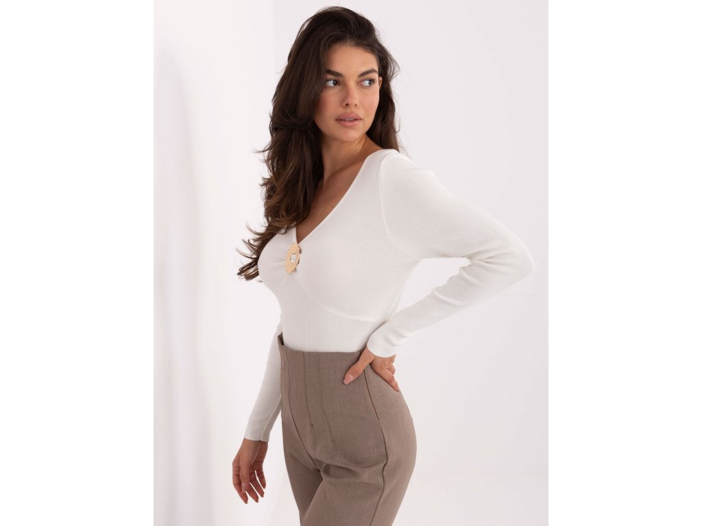 Dámsky sveter Fiona je nadčasový a elegantný kúsok, ktorý dokonale zvýrazní ženskú siluetu. Tento dámsky sveter v priliehavom strihu krásne kopíruje krivky postavy a vďaka hladkému prevedeniu pôsobí veľmi jemne a sofistikovane. Véčkový výstrih je ozvláštnený štýlovou zlatou sponou, ktorá dodáva celému modelu luxusný a ženský nádych.Mäkký, hebký a príjemný materiál je šetrný k pokožke a zabezpečuje vysoký komfort počas nosenia. Elegantný dámsky sveter Fiona sa skvele kombinuje s nohavicami, rifľami aj sukňami, a preto je vhodný do práce, na bežné dni,ale aj do ležérnych či elegantných outfitov.