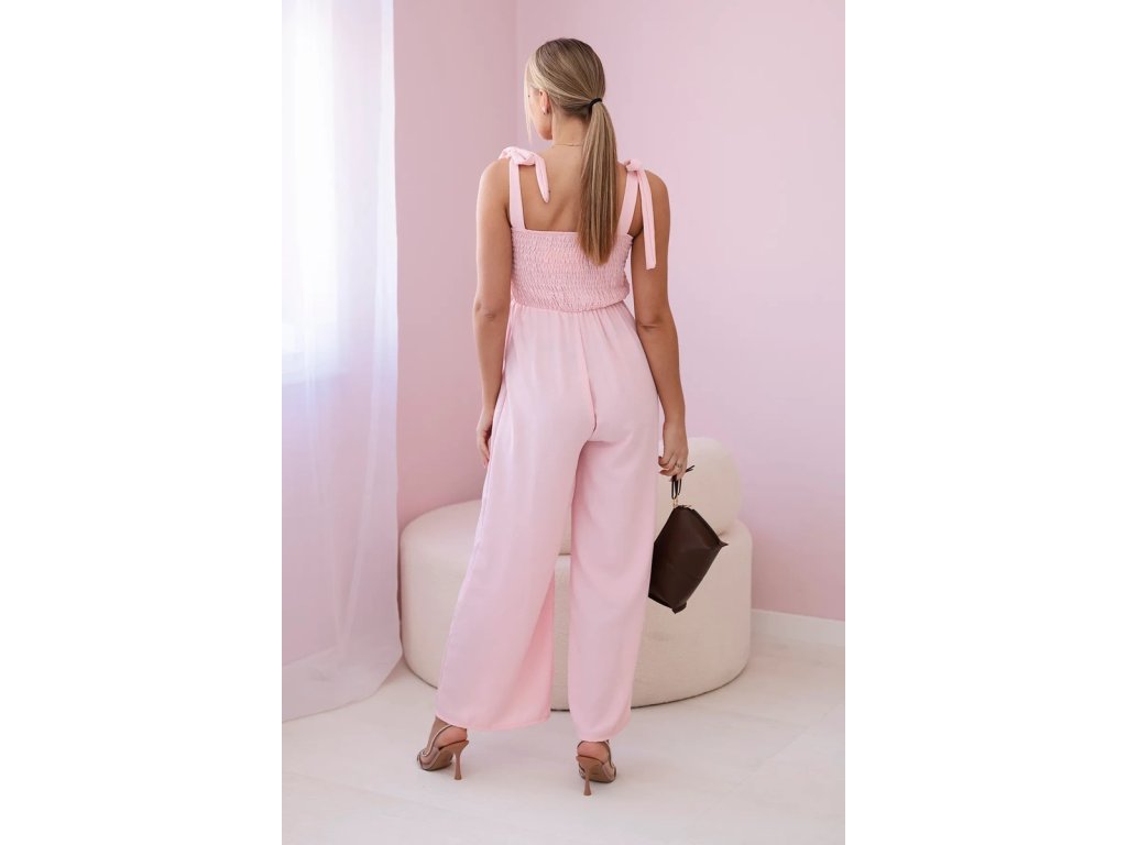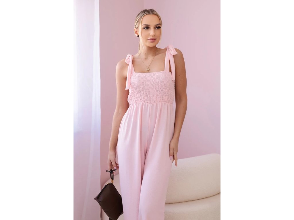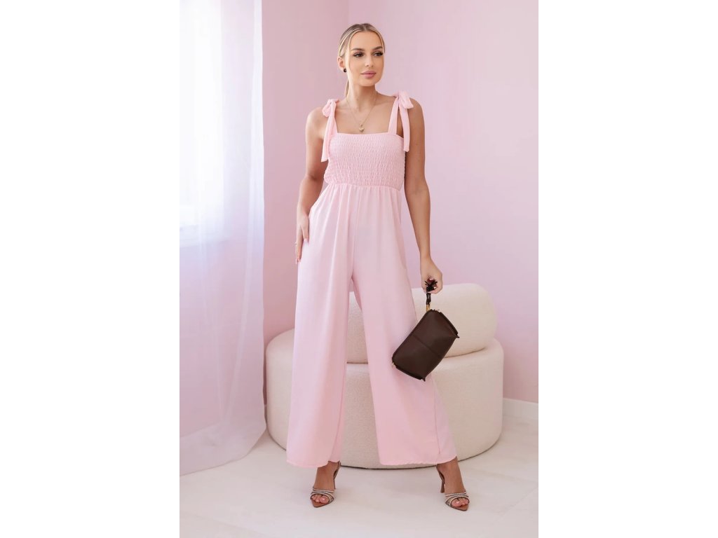Tento letný overal má klasický rovný strih s modernými širokými nohavicami.Vrchná časť obopína postavu nakoľko je prešívaná množstvom riasiacich gumičiek. Práve nariasený povrch vytvára výrazný akcent, zvýrazňuje dekolt a dodáva ženský šarm. Tento detail pekne kontrastuje s voľnou časťou nohavíc. Šnurovacie ramienka dodávajú celému stylingu ľahkosť a zároveň zaisťujú voľnosť pohybu nakoľko si ich výšku viete regulovať. Overal je vyrobený z kvalitných materiálov, ktoré zaisťujú pohodlie pri nosení ako aj to, že overal perfektne sedí na postave. Použitý materiál je ľahký, vzdušný a príjemne chladívý, čo tvorí ideálnu kombináciu na leto.Nechajte vyniknúť vašu ženskosť
