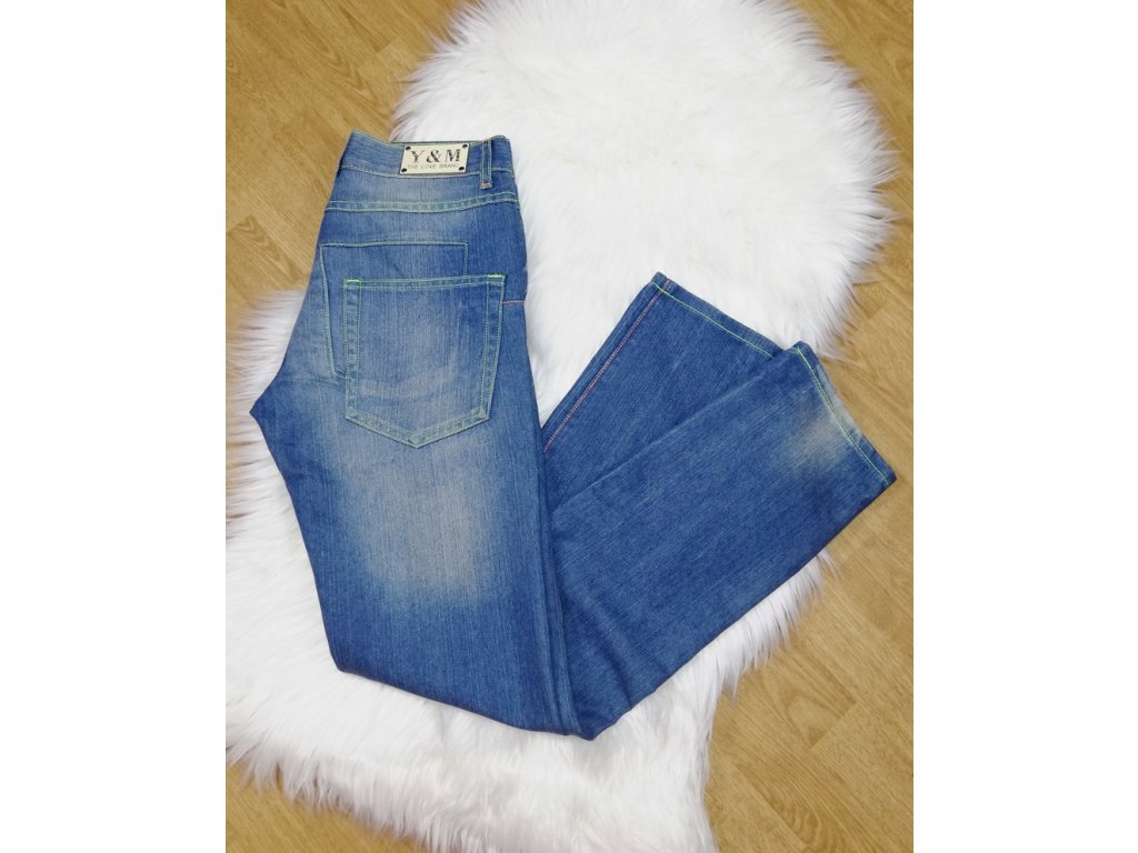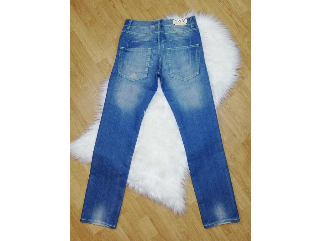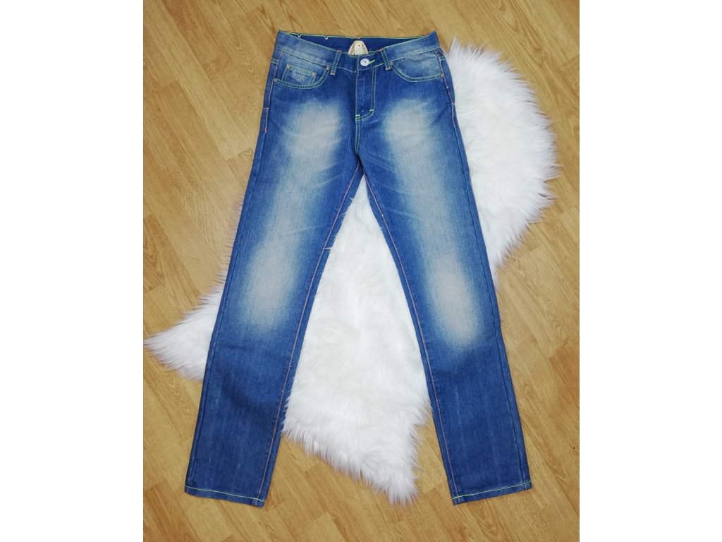 Dámske rifle bledomodrej farby sú ozvláštnené prešívaním s výraznou zelenou niťou Rifle majú klasický rovný strih ktorý zakryje aj širšie boky a vytvorí peknú ženskú siluetu. Ich celkový štýl podčiarkuje aj efektné vyšúchanie na prednej aj zadnej strane. Rifle majú tri predné a dve zadné vrecká. Zapínanie je aj v tomto prípade riešené prostredníctvom zipsu a gombíka.