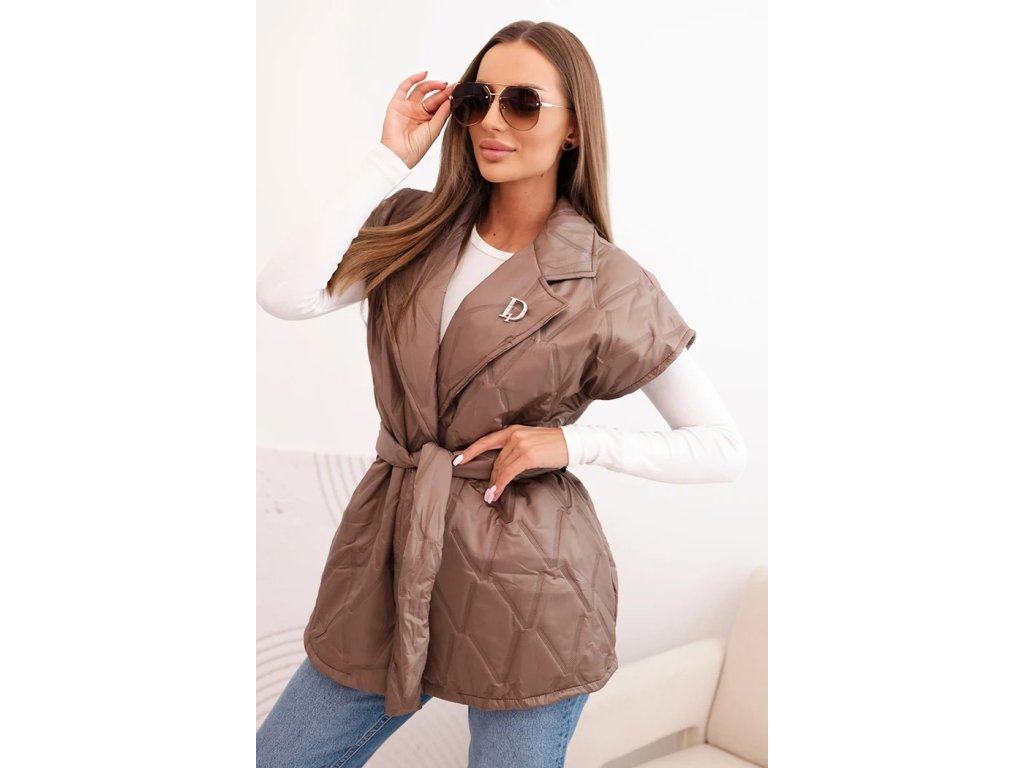 Štýlová dámska prešívaná vesta Cenia v originálnom prevedení je ideálnym kúskom do chladnejšieho jesenného počasia. Moderný strih v dĺžke pod zadok dopĺňa zapínanie na jeden gombík s viazaním v páse, ktoré krásne zvýrazní postavu. Prešívaná vesta má praktické dve bočné vrecká, elegantný véčkový výstrih s klopom a ozdobnú brošňu na klope, ktorá jej dodáva jedinečný charakter.Podšitá jesenná vesta je pohodlná na nosenie a vďaka univerzálnemu dizajnu sa skvele hodí na vrstvenie – či už k tričku, svetru alebo roláku. Vesta je vhodná na bežné nosenie, do práce, na výlety aj voľný čas a perfektne zapadne do ležérneho štýlu.