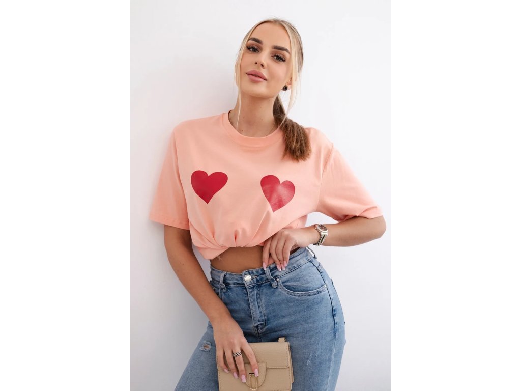 Tričko má klasický rovný strih s krátkymi rukávmi a okrúhlym výstrihom. Jeho hlavným prvkom je romantická potlač v podobe srdiečok, ktorá mu dodáva ženskosť a jemnú romantickú atmosféru. Tričko je vyrobené z vysoko kvalitnej bavlny, vďaka čomu sa pohodlne nosí po celý deň. Bavlna je navyše príjemná k pokožke, vhodná pre alergikov a vďaka prímesy elastanu sa tričko krásne prispôsobí vašej postave.